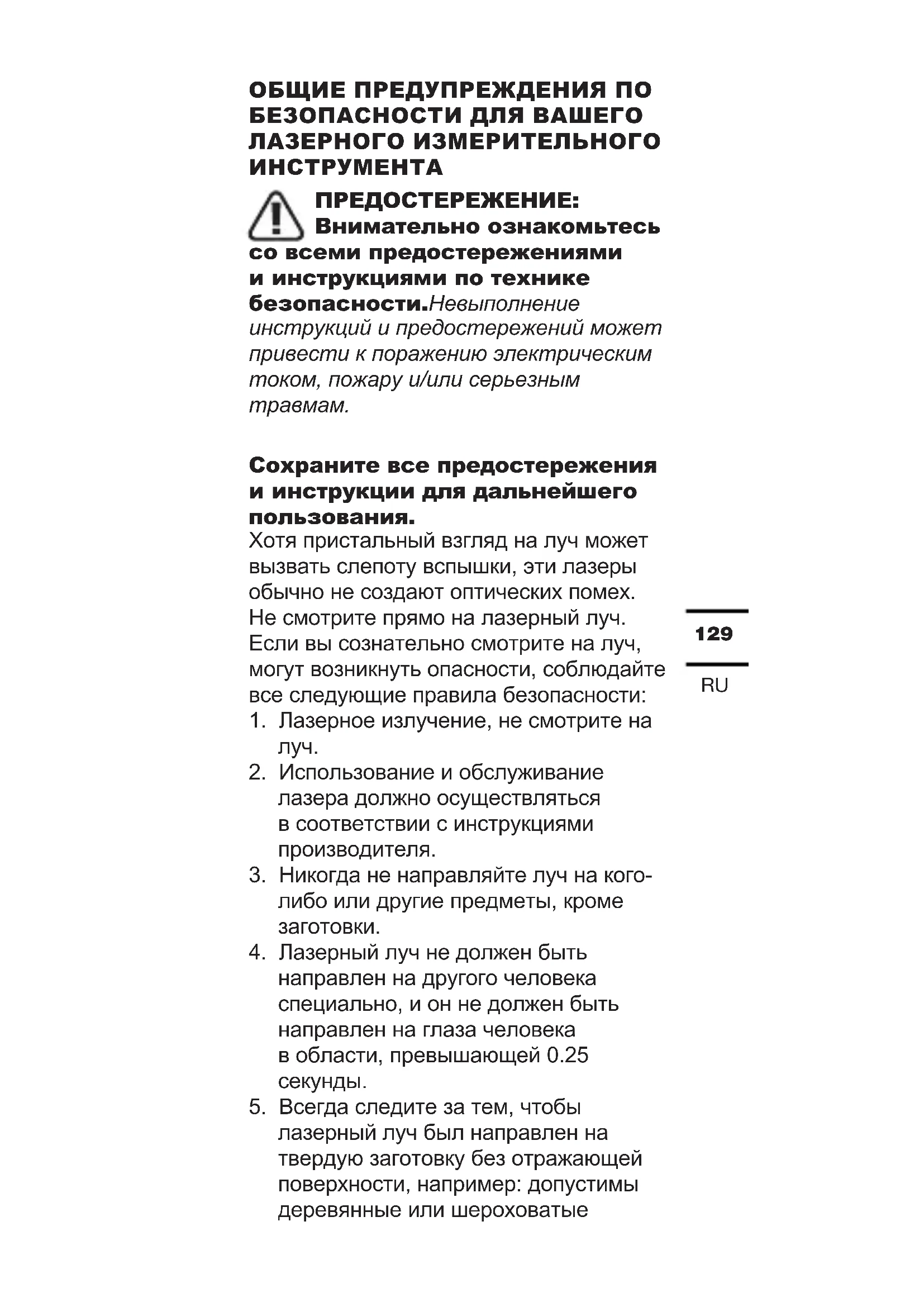 ОБЩИЕ ПРЕДУПРЕЖДЕНИЯ ПО БЕЗОПАСНОСТИ ДЛЯ ВАШЕГО ЛАЗЕРНОГО ИЗМЕРИТЕЛЬНОГО ИНСТРУМЕНТА ПРЕДОСТЕРЕЖЕНИЕ: Внимательно ознакомьтесь со всеми предостережениями и инструкциями по технике безопасности.Невыполнение инструкций и предостережений может привести к поражению электрическим током, пожару и/или серьезным