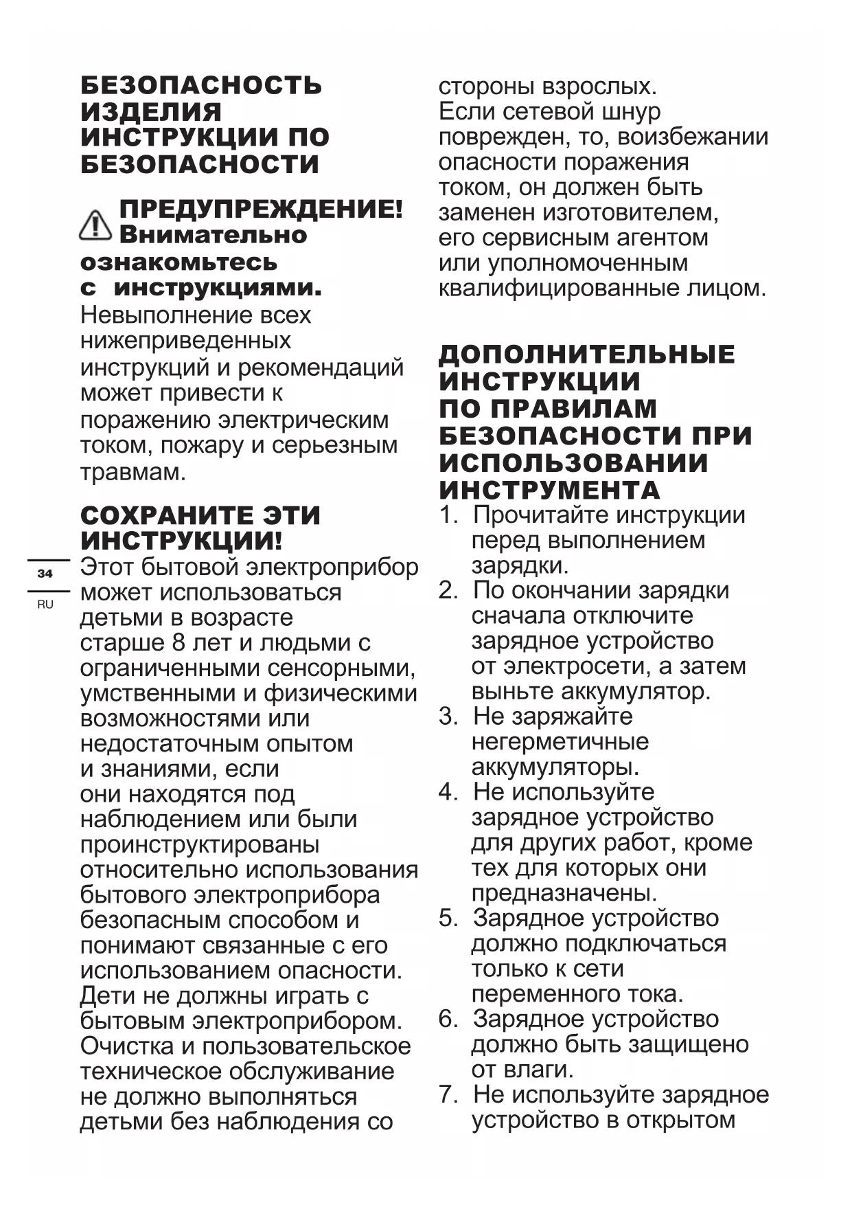 СОХРАНИТЕ ЭТИ ИНСТРУКЦИИ! Этот бытовой электроприбор может использоваться детьми в возрасте старше 8 лет и людьми с ограниченными сенсорными, умственными и физическими возможностями или недостаточным опытом и знаниями, если они находятся под наблюдением или были проинструктированы относительно использования бытового электроприбора безопасным способом и понимают связанные с его использованием опасности. Дети не должны играть с бытовым электроприбором. Очистка и пользовательское техническое обслуживание не должно выполняться детьми без наблюдения со стороны взрослых. Если сетевой шнур поврежден, то, воизбежании опасности поражения током, он должен быть заменен изготовителем, его сервисным агентом или уполномоченным квалифицированные лицом. ДОПОЛНИТЕЛЬНЫЕ