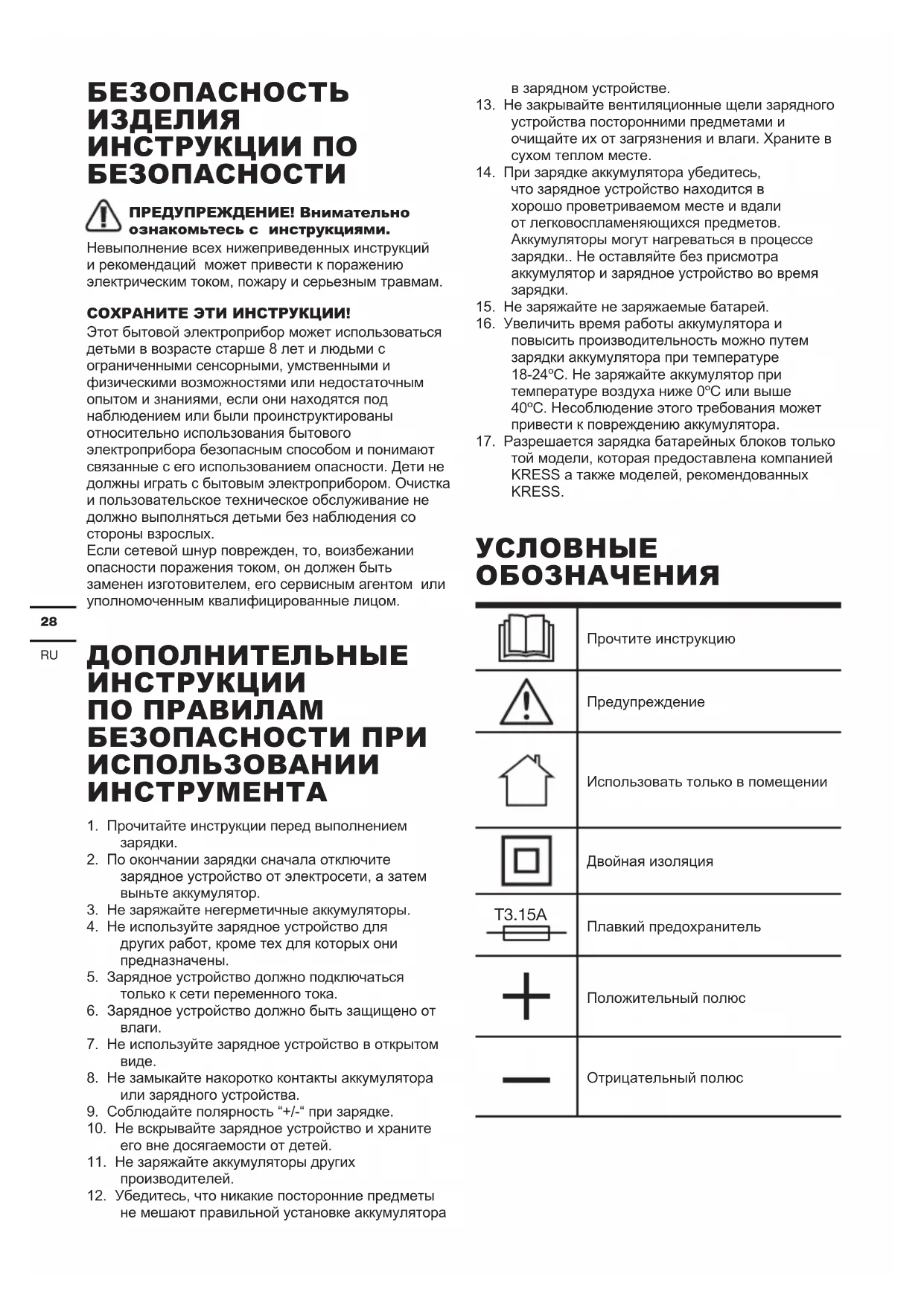 ОБОЗНАЧЕНИЯ Прочтите инструкцию Предупреждение Использовать только в помещении Двойная изоляция T3.15A Плавкий предохранитель Положительный полюс Отрицательный полюс29