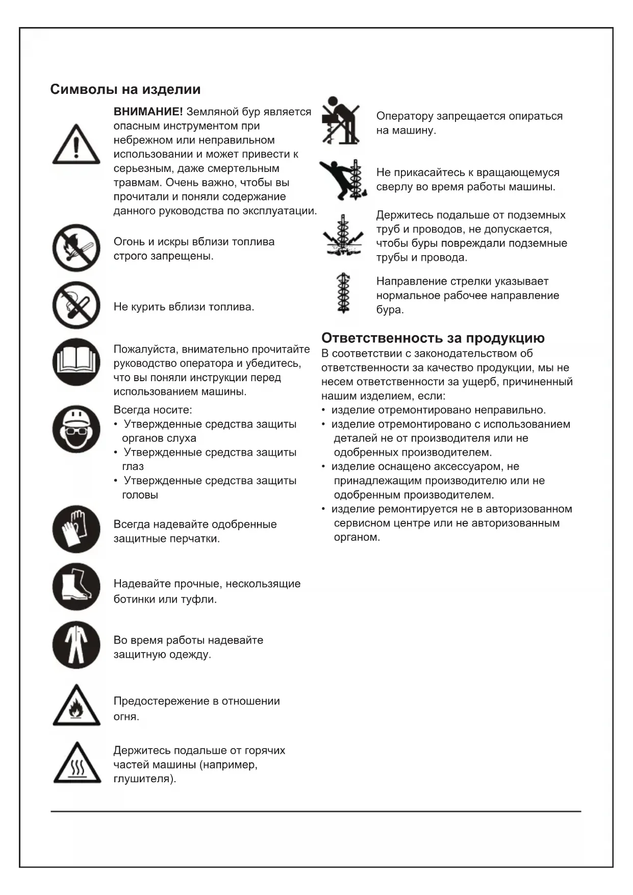 - Земляной бур является опасным инструментом при небрежном или неправильном использовании и может привести к серьезным, даже смертельным травмам. Очень важно, чтобы вы прочитали и поняли содержание данного руководства по эксплуатации.