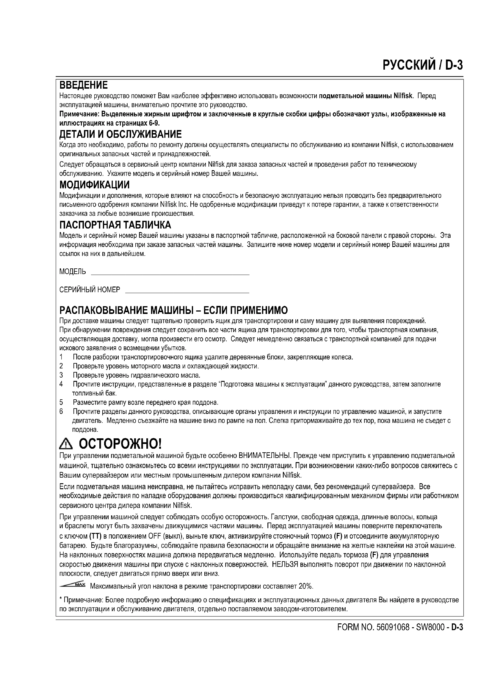 Настоящее руководство поможет Вам наиболее эффективно использовать возможности подметальной машины Nilfi sk. Перед эксплуатацией машины, внимательно прочтите это руководство. Примечание: Выделенные жирным шрифтом и заключенные в круглые скобки цифры обозначают узлы, изображенные на иллюстрациях на страницах 6-9. ДЕТАЛИ И ОБСЛУЖИВАНИЕ Когда это необходимо, работы по ремонту должны осуществлять специалисты по обслуживанию из компании Nilfi sk, с использованием оригинальных запасных частей и принадлежностей. Следует обращаться в сервисный центр компании Nilfi sk для заказа запасных частей и проведения работ по техническому обслуживанию. Укажите модель и серийный номер Вашей машины. МОДИФИКАЦИИ Модификации и дополнения, которые влияют на способность и безопасную эксплуатацию нельзя проводить без предварительного письменного одобрения компании Nilfi sk Inc. Не одобренные модификации приведут к потере гарантии, а также к ответственности заказчика за любые возникшие происшествия. ПАСПОРТНАЯ ТАБЛИЧКА Модель и серийный номер Вашей машины указаны в паспортной табличке, расположенной на боковой панели с правой стороны. Эта информация необходима при заказе запасных частей машины. Запишите ниже номер модели и серийный номер Вашей машины для ссылок на них в дальнейшем. МОДЕЛЬ ______________________________________________СЕРИЙНЫЙ НОМЕР ____________________________________ РАСПАКОВЫВАНИЕ МАШИНЫ – ЕСЛИ ПРИМЕНИМО При доставке машины следует тщательно проверить ящик для транспортировки и саму машину для выявления повреждений. При обнаружении повреждения следует сохранить все части ящика для транспортировки для того, чтобы транспортная компания, осуществляющая доставку, могла произвести его осмотр. Следует немедленно связаться с транспортной компанией для подачи искового заявления о возмещении убытков. 1 После разборки транспортировочного ящика удалите деревянные блоки, закрепляющие колеса. 2 Проверьте уровень моторного масла и охлаждающей жидкости. 3 Проверьте уровень гидравлического масла. 4 Прочтите инструкции, представленные в разделе “Подготовка машины к эксплуатации” данного руководства, затем заполните топливный бак. 5 Разместите рампу возле переднего края поддона. 6 Прочтите разделы данного руководства, описывающие органы управления и инструкции по управлению машиной, и запустите двигатель. Медленно съезжайте на машине вниз по рампе на пол. Слегка притормаживайте до тех пор, пока машина не съедет с