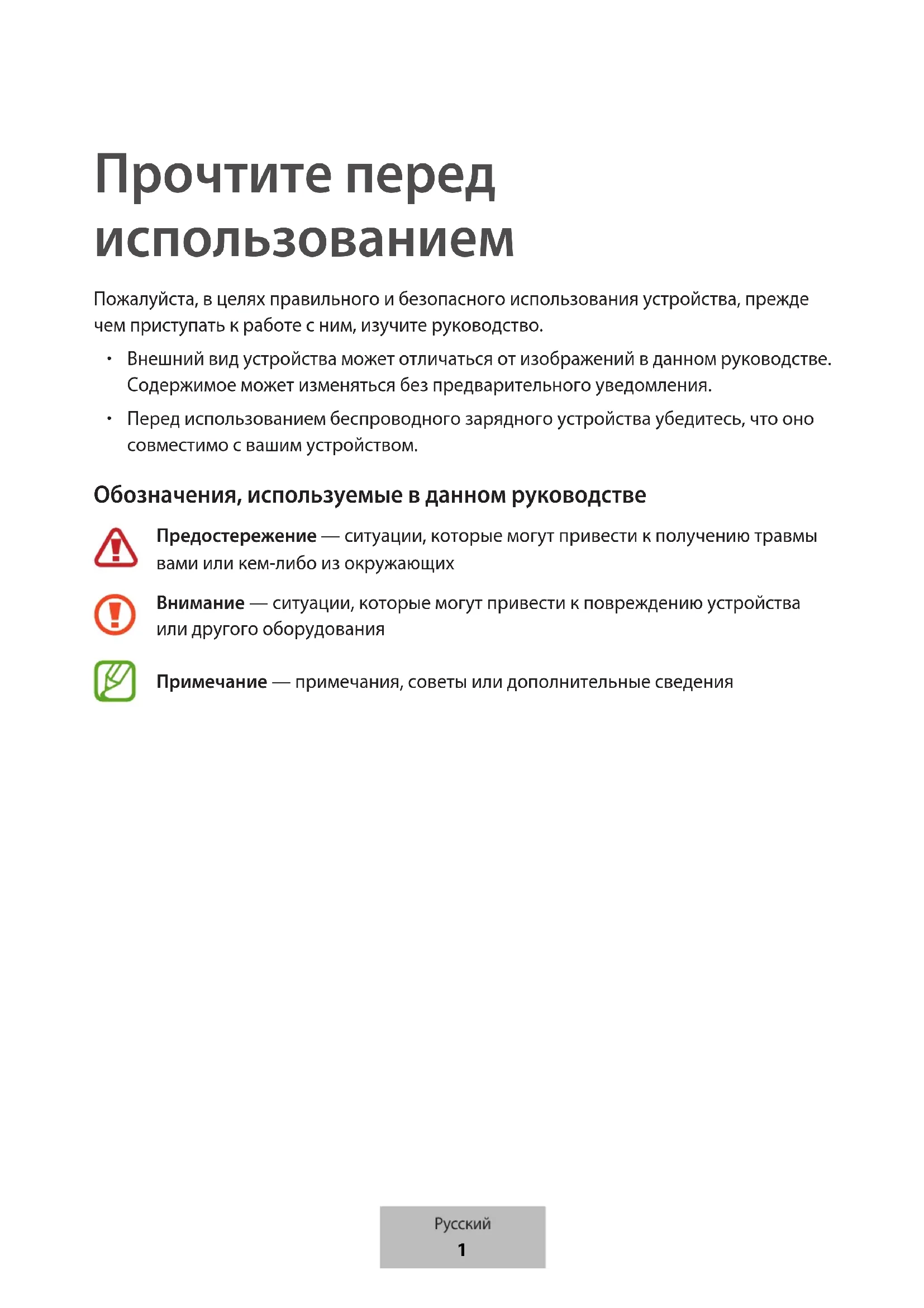 Перед использованием беспроводного зарядного устройства убедитесь, что оно совместимо с вашим устройством. Обозначения, используемые в данном руководстве Предостережение — ситуации, которые могут привести к получению травмы вами или кем-либо из окружающих Внимание — ситуации, которые могут привести к повреждению устройства или другого оборудования Примечание — примечания, советы или дополнительные сведения