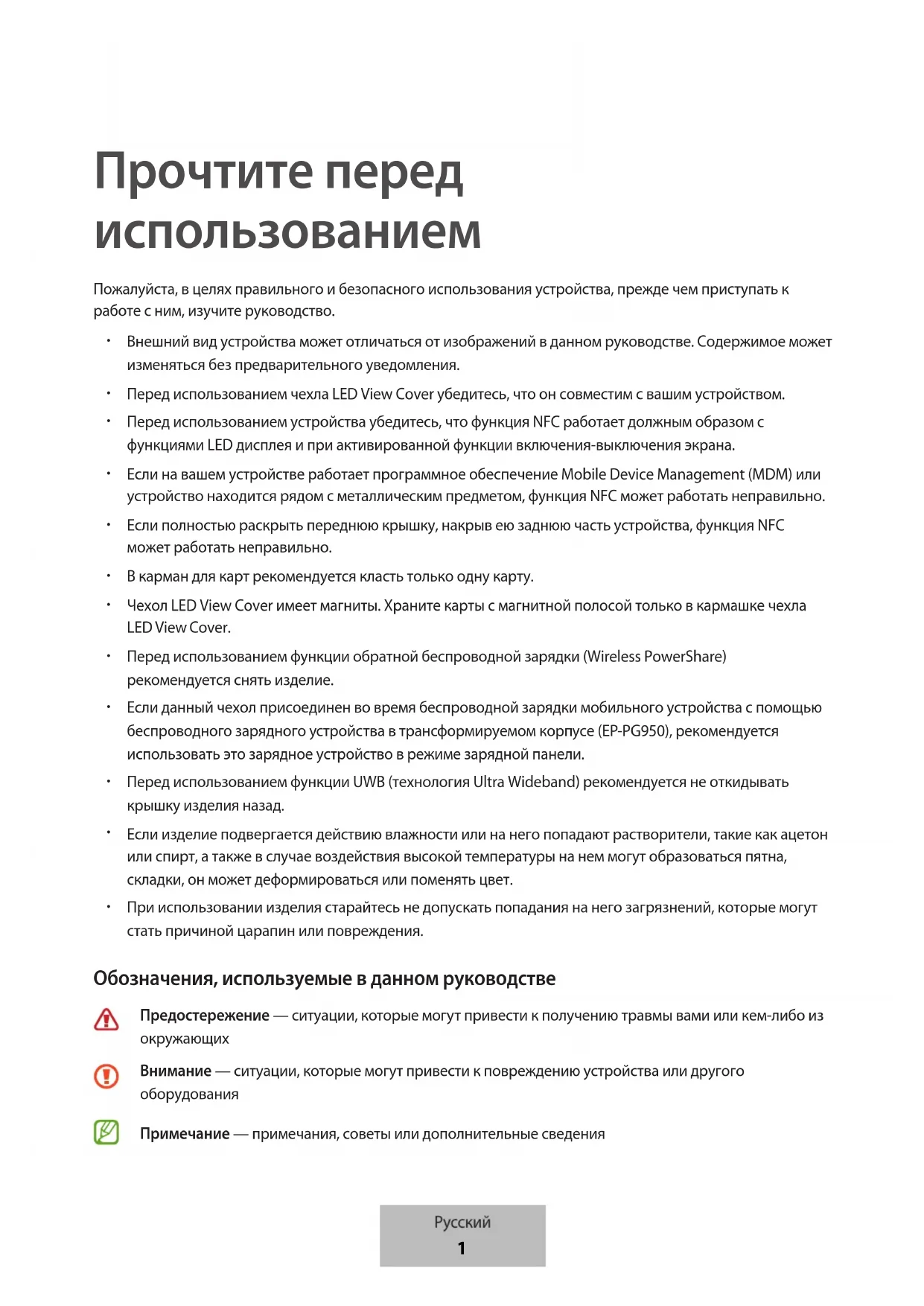Прочтите перед использованием Пожалуйста, в целях правильного и безопасного использования устройства, прежде чем приступать к работе с ним, изучите руководство. Внешний вид устройства может отличаться от изображений в данном руководстве. Содержимое может изменяться без предварительного уведомления. Перед использованием чехла LED View Cover убедитесь, что он совместим с вашим устройством. Перед использованием устройства убедитесь, что функция NFC работает должным образом c функциями LED дисплея и при активированной функции включения-выключения экрана. Если на вашем устройстве работает программное обеспечение Mobile Device Management (MDM) или устройство находится рядом с металлическим предметом, функция NFC может работать неправильно. Если полностью раскрыть переднюю крышку, накрыв ею заднюю часть устройства, функция NFC может работать неправильно. В карман для карт рекомендуется класть только одну карту. Чехол LED View Cover имеет магниты. Храните карты с магнитной полосой только в кармашке чехла LED View Cover. Перед использованием функции обратной беспроводной зарядки (Wireless PowerShare) рекомендуется снять изделие. Если данный чехол присоединен во время беспроводной зарядки мобильного устройства с помощью беспроводного зарядного устройства в трансформируемом корпусе (EP-PG950), рекомендуется использовать это зарядное устройство в режиме зарядной панели. Перед использованием функции UWB (технология Ultra Wideband) рекомендуется не откидывать крышку изделия назад. Если изделие подвергается действию влажности или на него попадают растворители, такие как ацетон или спирт, а также в случае воздействия высокой температуры на нем могут образоваться пятна, складки, он может деформироваться или поменять цвет. При использовании изделия старайтесь не допускать попадания на него загрязнений, которые могут стать причиной царапин или повреждения. Обозначения, используемые в данном руководстве Предостережение — ситуации, которые могут привести к получению травмы вами или кем-либо из окружающихВнимание — ситуации, которые могут привести к повреждению устройства или другого оборудованияПримечание — примечания, советы или дополнительные сведения