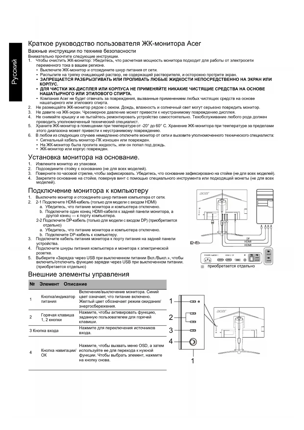 4Русский Правила ипримечания по технике безопасности Примечание FCC Данное устройство было протестировано ипризнано соответствующим ограничениям для цифрового устройства класса B, в соответствии счастью 15 правил FCC. Эти ограничения разработаны для обеспечения приемлемой защиты от вредных помех при установке вжилых помещениях. Данное устройство генерирует, использует иможет излучать радиочастотную энергию. Если оно установлено и используется не в соответствии с инструкциями, оно может вызывать вредные помехи при радиосвязи. Однако, нет никакой гарантии, что помехи не будут возникать вкаждом конкретном случае. Если данное устройство вызывает вредные помехи для приема радио- и телевизионного сигнала, что можно определить, включив ивыключив устройство, пользователю рекомендуется попытаться устранить помехи, выполнив одно или несколько из следующих действий: Переориентировать или переместить приемную антенну. Увеличить расстояние между устройством иприемником. Подключите устройство к розетке вцепи, отличной от той, к которой подключен приемник. Обратитесь за помощью кдилеру или опытному специалисту по радио-/телевизионному оборудованию. Декларация соответствия CE Настоящим компания Acer Inc., заявляет, что данный ЖК-монитор соответствует основным требованиям идругим соответствующим положениям Директивы по электромагнитной совместимости 2014/30/EU, Директивы по низковольтному оборудованию 2014/35/ EU, Директивы об ограничении использования некоторых вредных веществ в электрическом и электронном оборудовании 2011/65/EU и Директивы 2009/125/EC относительно создания основы для установки требований кэкодизайну энергосберегающего продукта. Примечание: Чтобы не повредить монитор, не поднимайте его за основание. Примечание: Экранированные кабели Все подключения кдругим вычислительным устройствам должны производиться спомощью экранированных кабелей в соответствии справилами электромагнитной совместимости. Примечание: Монитор Acer предназначен для воспроизведения видеосигнала и визуального отображения информации, полученной с электронных носителей. Примечание: Периферийные устройства К данному оборудованию можно подключать только периферийные устройства (устройства ввода/вывода, оконечные устройства, принтеры ит. д.), сертифицированные на соответствие ограничениям класса B. Использование несертифицированных периферийных устройств может привести к возникновению помех вприеме радио- и телевизионных сигналов. Предупреждение Изменения или модификации, не одобренные производителем, могут привести к лишению пользователя полномочий на эксплуатацию данного устройства, предоставленных Федеральной комиссией по средствам коммуникаций. Условия эксплуатации Данное устройство соответствует требованиям части 15 правил FCC. Эксплуатация допускается при соблюдении следующих двух условий: (1) данное устройство не должно создавать вредных помех, и (2) данное устройство может принимать любые помехи, включая помехи, которые могут препятствовать нормальной эксплуатации. Примечание: Для пользователей в Канаде Данное цифровое устройство класса B соответствует канадскому стандарту ICES-003. Remarque à l'intention des utilisateurs canadiens Cet appareil numérique de la classe B est conforme à la norme NMB-003 du Canada. Утилизация отслужившего оборудования пользователями из частных домов в стран