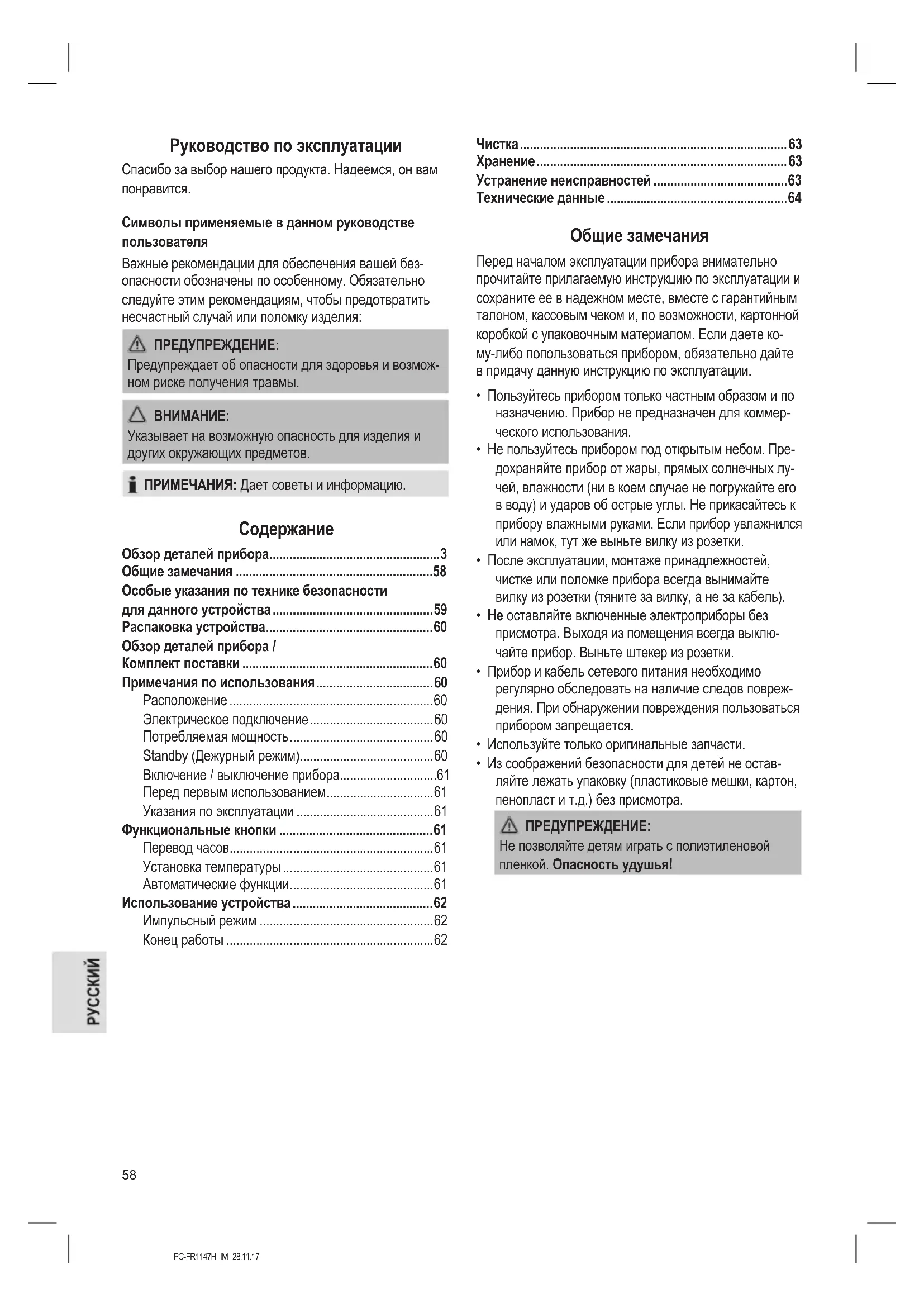 - Технические данные Общие замечания Перед началом эксплуатации прибора внимательно прочитайте прилагаемую инструкцию по эксплуатации и сохраните ее в надежном месте, вместе с гарантийным талоном, кассовым чеком и, по возможности, картонной коробкой с упаковочным материалом. Если даете ко- му-либо попользоваться прибором, обязательно дайте в придачу данную инструкцию по эксплуатации. p. 64