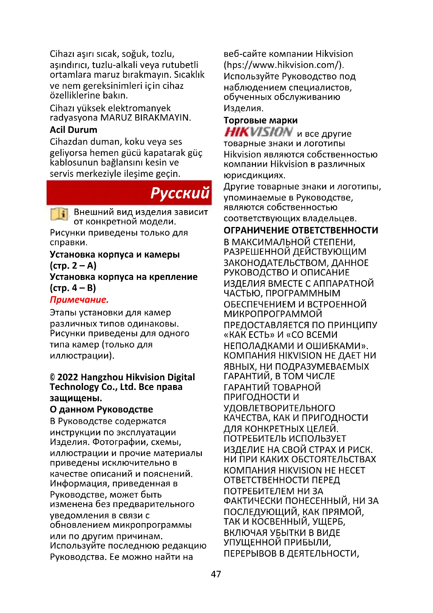 Установка корпуса и камеры (стр. 2 – A) Установка корпуса на крепление (стр. 4 – B) Примечание. Этапы установки для камер различных типов одинаковы. Рисунки приведены для одного типа камер (только для иллюстрации). © 2022 Hangzhou Hikvision Digital Technology Co., Ltd. Все права