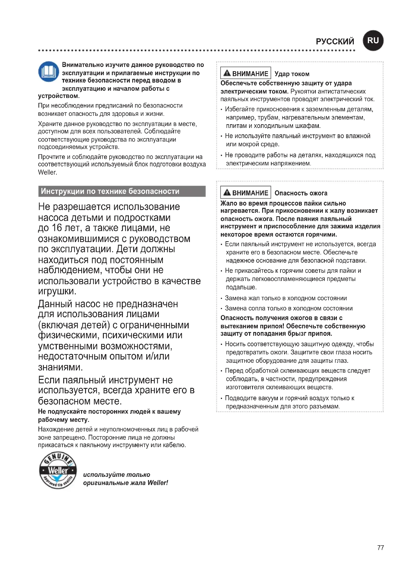 Если паяльный инструмент не используется, всегда храните его в безопасном месте. Не подпускайте посторонних людей к вашему рабочему месту. Нахождение детей и неуполномоченных лиц в рабочей зоне запрещено. Посторонние лица не должны прикасаться к паяльному инструменту или кабелю. используйте только оригинальные жала Weller!