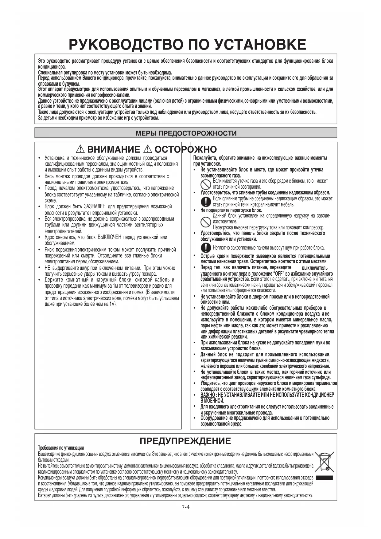 Требования по утилизации Ваше изделие для кондиционирования воздуха отмечено этим символом. Это означает, что электрические и электронные изделия не должны быть смешаны с несортированными бытовым отходами. Не пытайтесь самостоятельно демонтировать систему: демонтаж системы кондиционирования воздуха, обработка хладагента, масла и других деталей должна быть произведена квалифицированным специалистом по установке согласно соответствующему местному и национальному законодательству. Кондиционеры воздуха должны быть обработаны на специализированном перерабатывающем оборудовании для повторной утилизации, повторного использования отходов и восстановления. Убедившись в том, что данное изделие правильно утилизировано, вы поможете предотвратить потенциальные негативные последствия для окружающей среды и здоровья людей. Для получения подробной информации обратитесь, пожалуйста, к вашему специалисту по установке или местным властям. Батареи должны быть удалены из пульта дистанционного управления и утилизированы отдельно согласно соответствующему местному и национальному законодательству. Это руководство рассматривает процедуру установки с целью обеспечения безопасности и соответствующих стандартов для функционирования блока кондиционера. Специальная регулировка по месту установки может быть необходима. Перед использованием Вашего кондиционера, прочитайте, пожалуйста, внимательно данное руководство по эксплуатации и сохраните его для обращения за справками в будущем. Этот аппарат предусмотрен для использования опытным и обученным персоналом в магазинах, в легкой промышленности и сельском хозяйстве, или для коммерческого применения непрофессионалами. Данное устройство не предназначено к эксплуатации лицами (включая детей) с ограниченными физическими, сенсорными или умственными возможностями, а равно и теми, у кого нет соответствующего опыта и знаний. Такие лица допускаются к эксплуатации устройства только под наблюдением или руководством лица, несущего ответственность за их безопасность. За детьми необходим присмотр во избежание игр с устройством. 7 IM-5WMYJ-1113(2)DK SIESTA_RU.i4 4 1/8/15 2:17:49 PM7-5