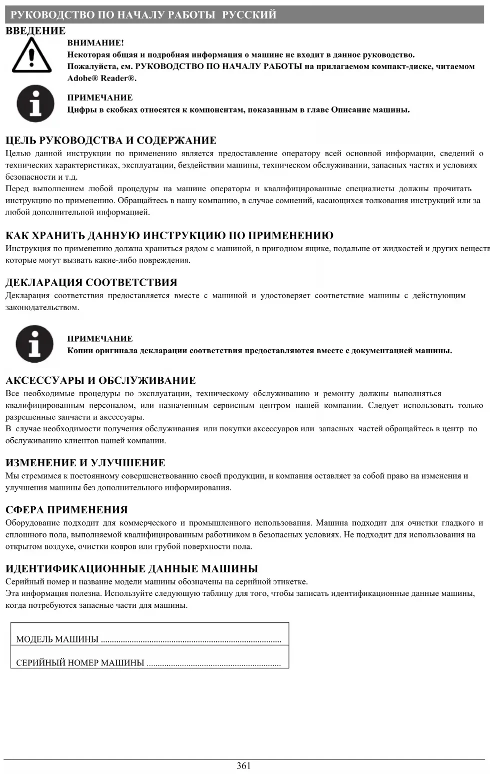 Копии оригинала декларации соответствия предоставляются вместе с документацией машины. АКСЕССУАРЫ И ОБСЛУЖИВАНИЕ Все необходимые процедуры по эксплуатации, техническому обслуживанию и ремонту должны выполняться квалифицированным персоналом, или назначенным сервисным центром нашей компании. Следует использовать только разрешенные запчасти и аксессуары. В случае необходимости получения обслуживания или покупки аксессуаров или запасных частей обращайтесь в центр по обслуживанию клиентов нашей компании. ИЗМЕНЕНИЕ И УЛУЧШЕНИЕ Мы стремимся к постоянному совершенствованию своей продукции, и компания оставляет за собой право на изменения и улучшения машины без дополнительного информирования. СФЕРА ПРИМЕНЕНИЯ Оборудование подходит для коммерческого и промышленного использования. Машина подходит для очистки гладкого и сплошного пола, выполняемой квалифицированным работником в безопасных условиях. Не подходит для использования на открытом воздухе, очистки ковров или грубой поверхности пола. ИДЕНТИФИКАЦИОННЫЕ ДАННЫЕ МАШИНЫ Серийный номер и название модели машины обозначены на серийной этикетке. Эта информация полезна. Используйте следующую таблицу для того, чтобы записать идентификационные данные машины, когда потребуются запасные части для машины. МОДЕЛЬ МАШИНЫ ..................................................................................