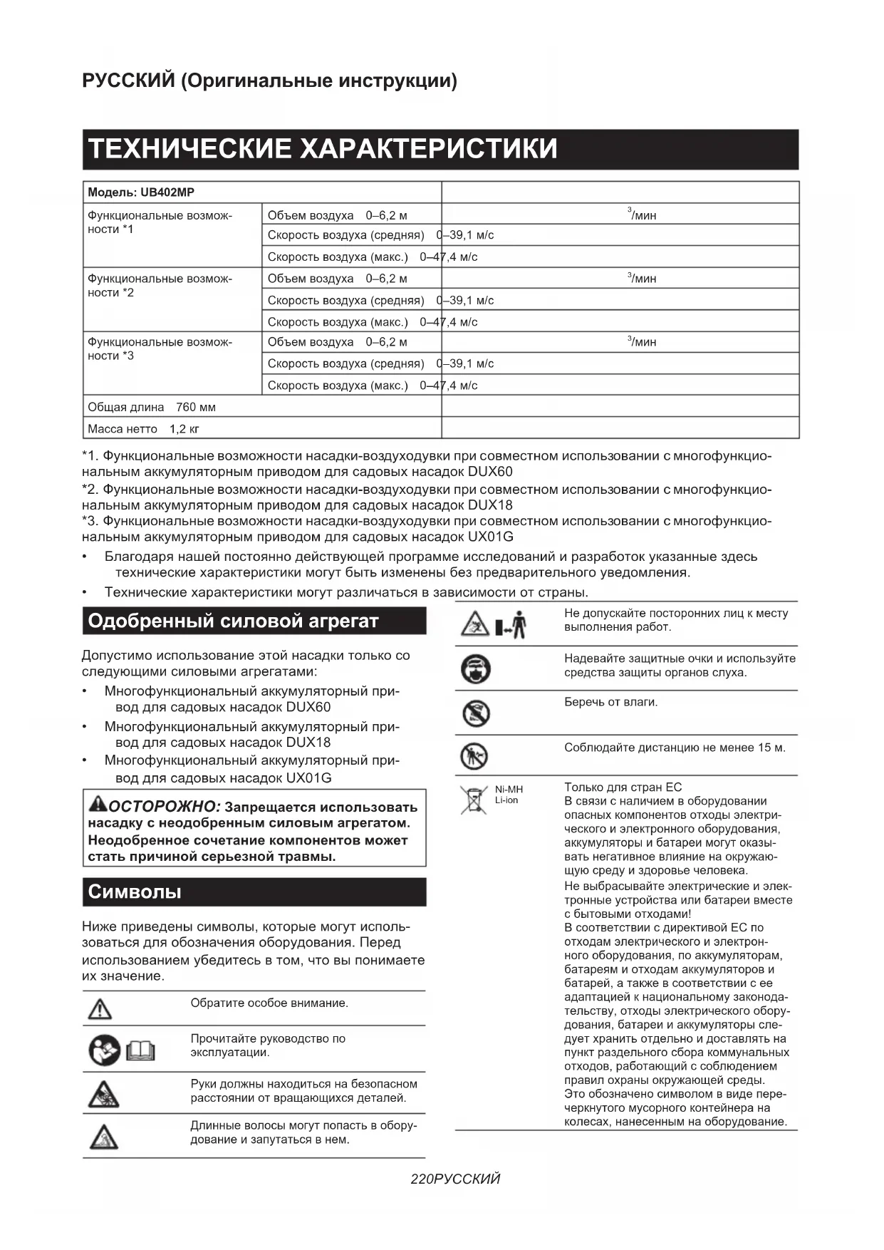 Декларация о соответствии ЕС Только для европейских стран Мы,производители:Makita Europe N.V.,адреском- пании:Jan-Baptist Vinkstraat 2 3070 Kortenberg BELGIUM (Бельгия),предоставляемХироши Цудзимуре (Hiroshi Tsujimura)правонасоставле- ниетехническойдокументацииизаявляемподнашу исключительнуюответственность,чтопродукция; Обозначение:насадка-воздуходувка.Обозначение типа:UB402MP. соответствуетположениям2006/42/ECиположе- ниямследующихдирективEC/EU:2000/14/EC,а такжеизготовленавсоответствиисоследующими единымистандартами:EN 60335-1:2012+A11:2 014+A13:2017+A1:2019+A14:2019+A2:2019, EN 50636-2-100:2014. Местоидатапринятиядекларации:Kortenberg, Belgium (Бельгия). 31.10.2022 Ответственноелицо:Хироши Цудзимура (Hiroshi Tsujimura), руководитель компании Makita Europe N.V. МЕРЫ БЕЗОПАСНОСТИ Инструкции по технике безопасности при эксплуатации воздуходувки ОСТОРОЖНО: Перед использованием этого инструмента ознакомьтесь со всеми правилами техники безопасности, инструкци- ями, иллюстрациями и техническими харак- теристиками, прилагаемыми к нему, а также с руководством по эксплуатации силового агре- гата.Несоблюдениеуказанныхдалееинструкций можетпривестикпоражениюэлектрическим током,пожаруи/илитяжелойтравмеоператораи/ илиокружающих. Сохраните брошюру с инструк- циями и рекомендациями для дальнейшего использования. Подтерминами“электрощетка/электрометла”и “инструмент”вдокументепобезопасностиимерам предосторожностиподразумеваетсясочетание насадкиисиловогоагрегата.