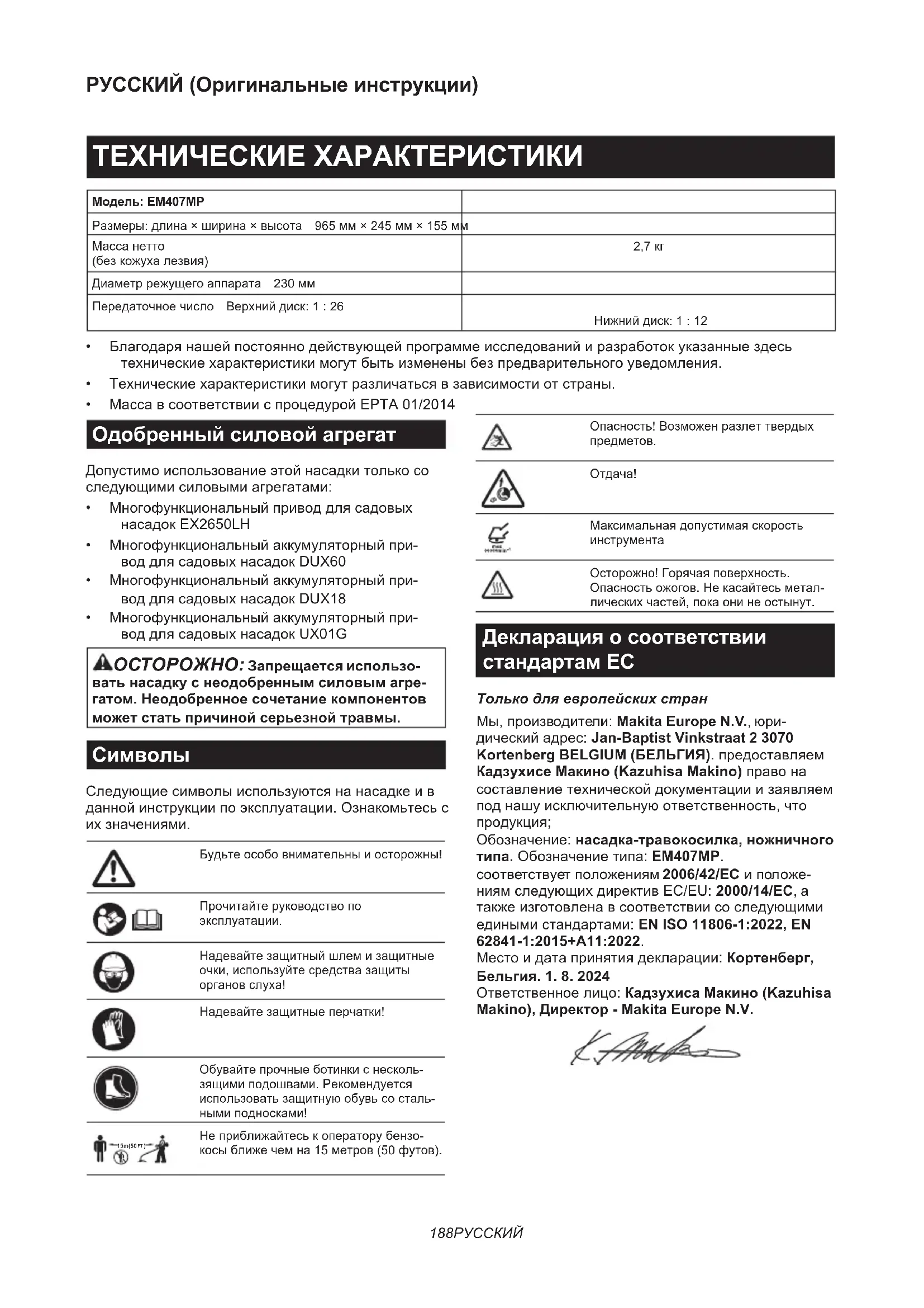 Обозначение:насадка-травокосилка, ножничного типа.Обозначениетипа:EM407MP. соответствуетположениям2006/42/ECиположе- ниямследующихдирективEC/EU:2000/14/EC,а такжеизготовленавсоответствиисоследующими единымистандартами:EN ISO 11806-1:2022, EN 62841-1:2015+A11:2022. Местоидатапринятиядекларации:Кортенберг, Бельгия. 1. 8. 2024 Ответственноелицо:Кадзухиса Макино (Kazuhisa Makino), Директор - Makita Europe N.V.189 РУССКИЙ МЕРЫ БЕЗОПАСНОСТИ Общие рекомендации по технике безопасности для электроинструментов ОСТОРОЖНО Ознакомьтесь со всеми инструкциями по технике безопасности, указа- ниями, иллюстрациями и техническими характе- ристиками, прилагаемыми к данному электроин- струменту.Несоблюдениевсехприведенныхдалее инструкцийможетпривестикпоражениюэлектриче- скимтоком,возгораниюи/илитяжелымтравмам. Сохраните брошюру с инструк- циями и рекомендациями для дальнейшего использования. Термин"электроинструмент"впредупреждениях относитсяковсемуинструменту,работающему отсети(спроводом)илинааккумуляторах(без