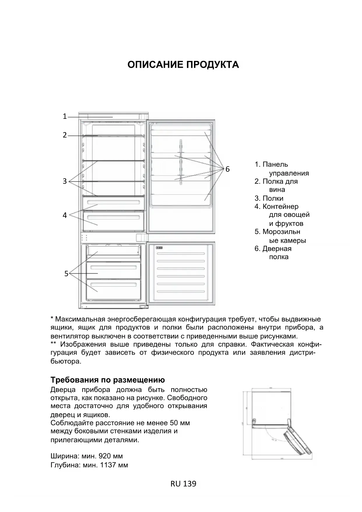Требования по размещению Дверца прибора должна быть полностью открыта, как показано на рисунке. Свободного места достаточно для удобного открывания дверец и ящиков. Соблюдайте расстояние не менее 50 мм между боковыми стенками изделия и прилегающими деталями. Ширина: мин. 920 мм Глубина: мин. 1137 мм