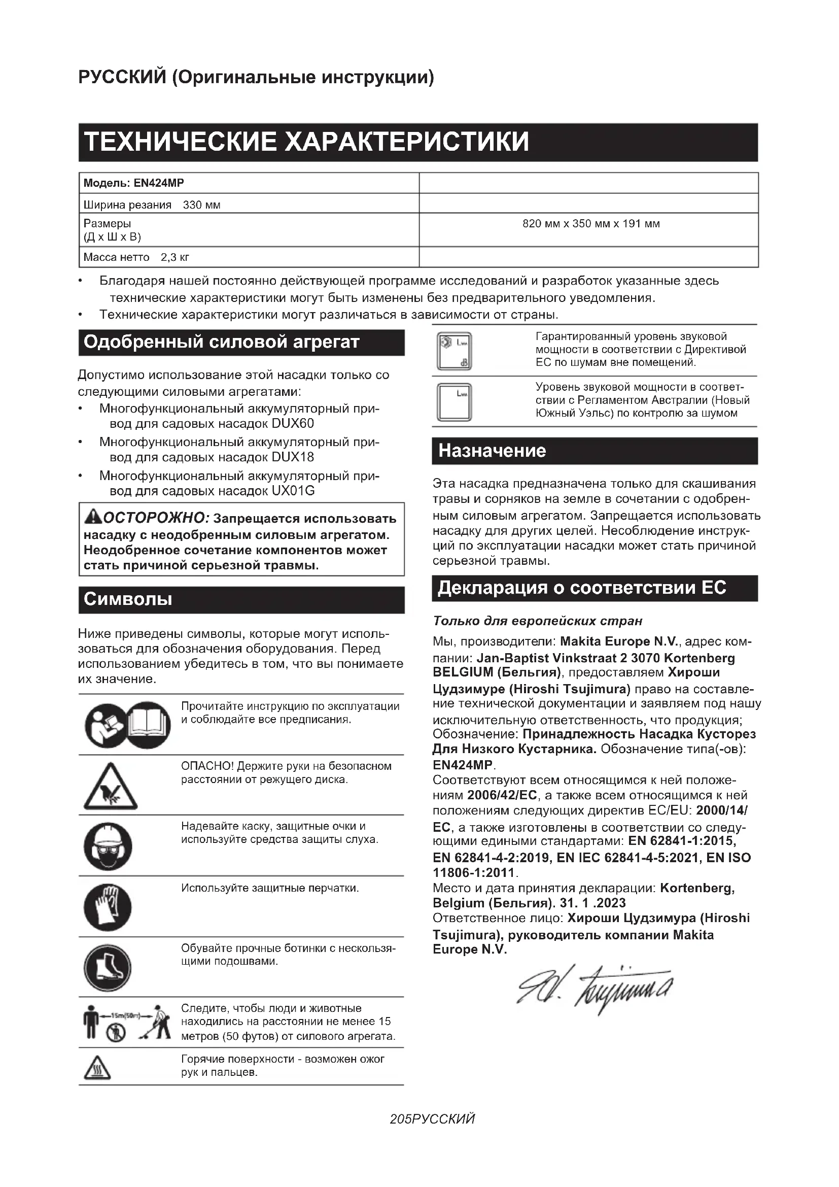 Этанасадкапредназначенатолькодляскашивания травыисорняковназемлевсочетаниисодобрен- нымсиловымагрегатом.Запрещаетсяиспользовать насадкудлядругихцелей.Несоблюдениеинструк- цийпоэксплуатациинасадкиможетстатьпричиной серьезнойтравмы. Декларация о соответствии ЕС Только для европейских стран Мы,производители:Makita Europe N.V.,адреском- пании:Jan-Baptist Vinkstraat 2 3070 Kortenberg BELGIUM (Бельгия),предоставляемХироши Цудзимуре (Hiroshi Tsujimura)правонасоставле- ниетехническойдокументацииизаявляемподнашу исключительнуюответственность,чтопродукция; Обозначение:Принадлежность Насадка Кусторез Для Низкого Кустарника.Обозначениетипа(-ов): EN424MP. Соответствуютвсемотносящимсякнейположе- ниям2006/42/EC,атакжевсемотносящимсякней положениямследующихдирективEC/EU:2000/14/ EC,атакжеизготовленывсоответствиисоследу- ющимиединымистандартами:EN 62841-1:2015, EN 62841-4-2:2019, EN IEC 62841-4-5:2021, EN ISO 11806-1:2011. Местоидатапринятиядекларации:Kortenberg, Belgium (Бельгия). 31. 1 .2023 Ответственноелицо:Хироши Цудзимура (Hiroshi Tsujimura), руководитель компании Makita Europe N.V.206 РУССКИЙ МЕРЫ БЕЗОПАСНОСТИ Правила техники безопасности при эксплуатации аккумуляторных ножниц для