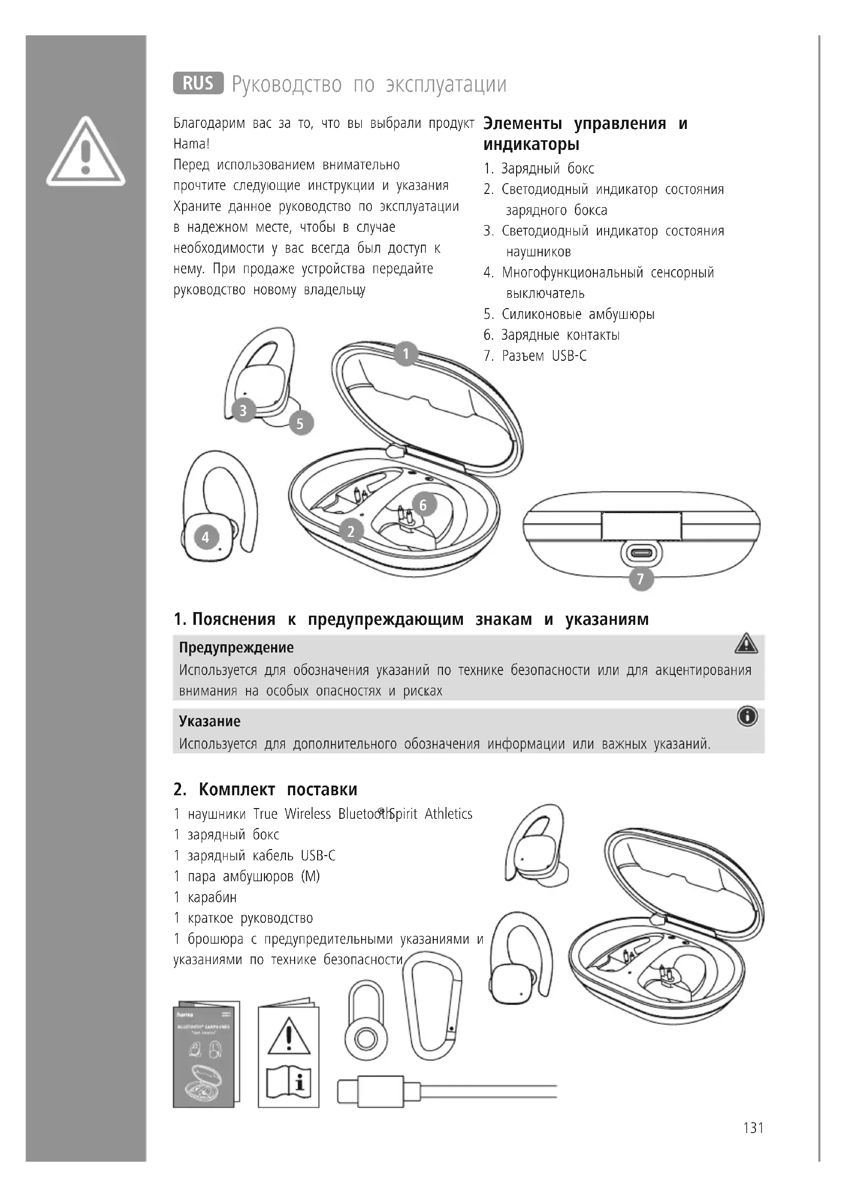 Spirit Athletics 1 зарядный бокс 1 зарядный кабель USB-C 1 пара амбушюров (М) 1 карабин 1 краткое руководство 1 брошюра с предупредительными указаниями и указаниями по технике безопасности R Руководство по эксплуатации