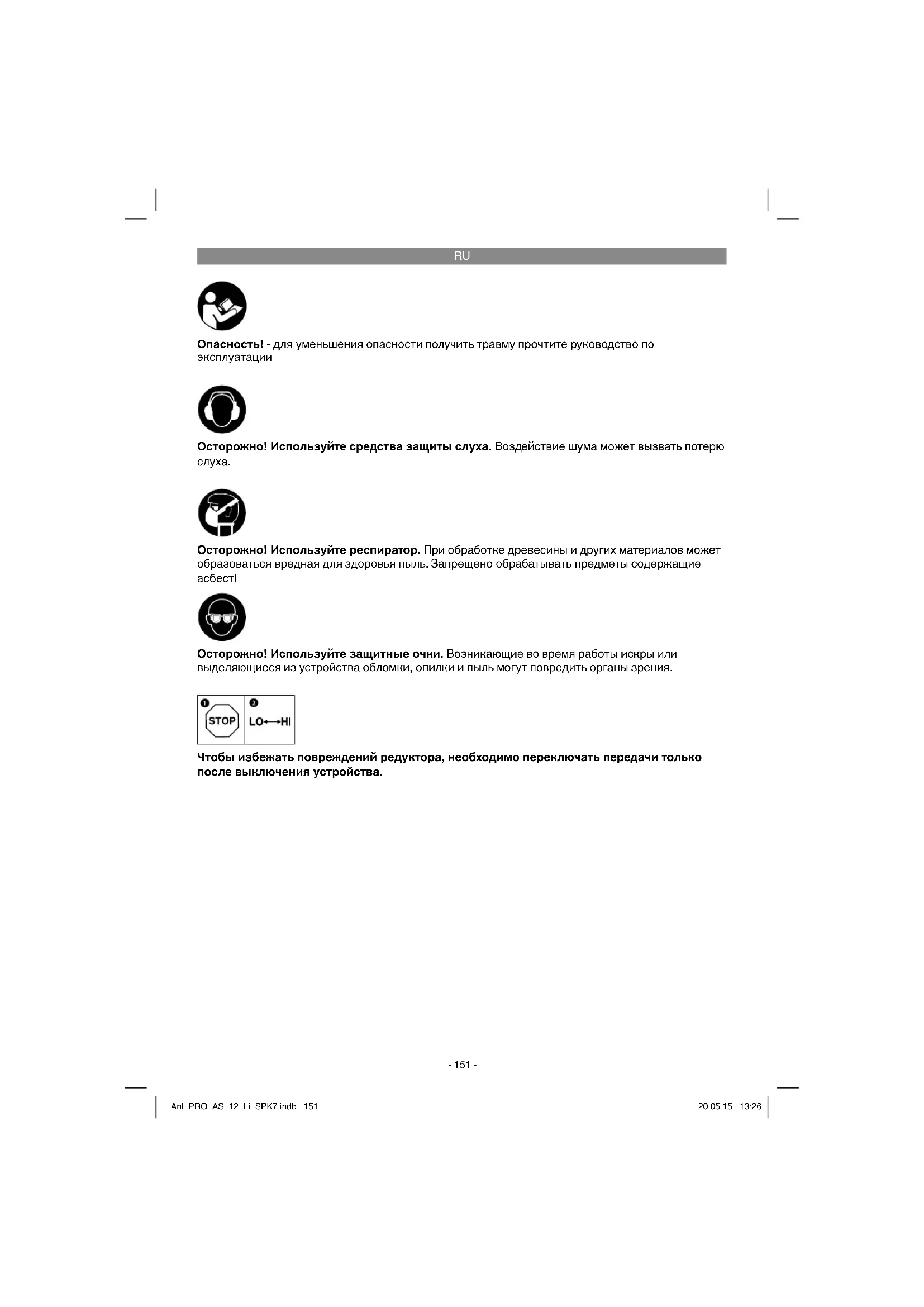 Опасность! - для уменьшения опасности получить травму прочтите руководство по эксплуатации Осторожно! Используйте средства защиты слуха. Воздействие шума может вызвать потерю