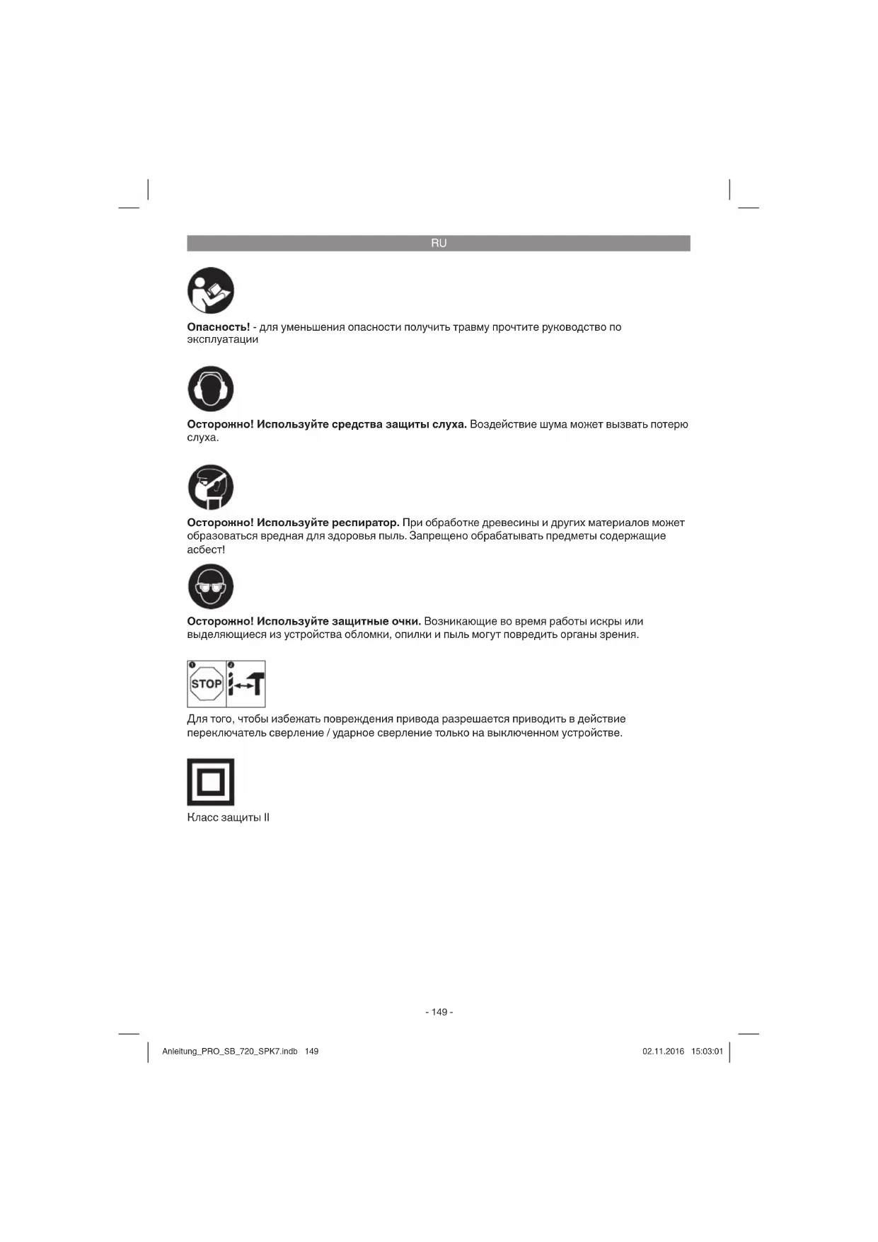 Для того, чтобы избежать повреждения привода разрешается приводить в действие переключатель сверление / ударное сверление только на выключенном устройстве. Класс защиты II Anleitung_PRO_SB_720_SPK7.indb 149Anleitung_PRO_SB_720_SPK7.indb 149 02.11.2016 15:03:0102.11.2016 15:03:01RU