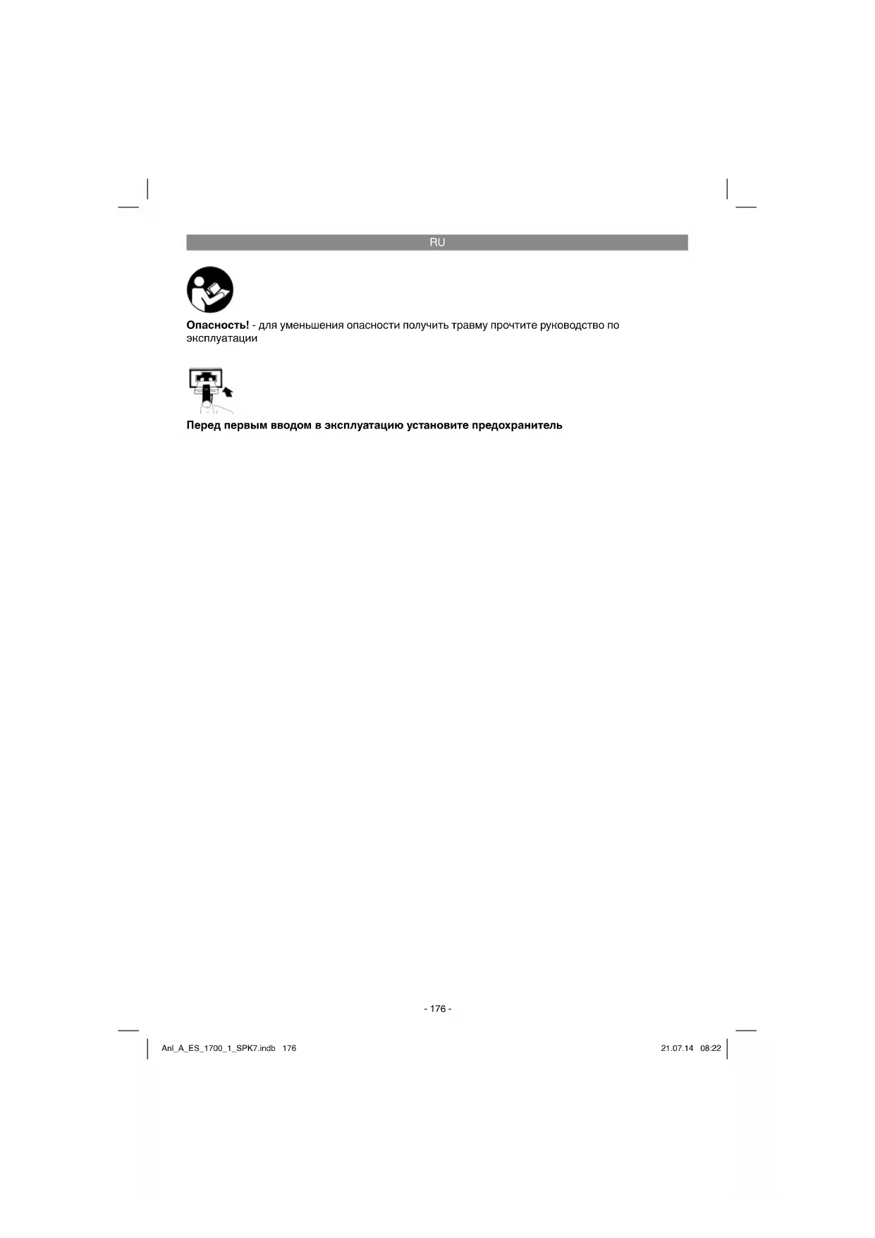 Опасность! - для уменьшения опасности получить травму прочтите руководство по эксплуатации Перед первым вводом в эксплуатацию установите предохранитель Anl_A_ES_1700_1_SPK7.indb 176Anl_A_ES_1700_1_SPK7.indb 176 21.07.14 08:2221.07.14 08:22RU