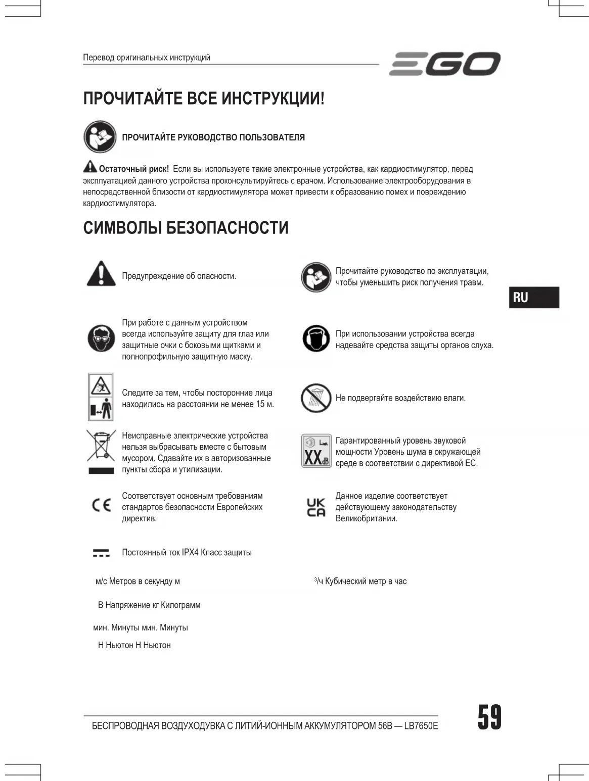 ГАРАНТИЙНАЯ ПОЛИТИКА EGO Посетите веб-сайт egopowerplus.com, чтобы ознакомиться со всеми условиями и сроками гарантийной политики EGO.DMUCHAWA BEZPRZEWODOWA Z BATERIĄ LITOWO-JONOWĄ 56 WOLTÓW — LB7650E64