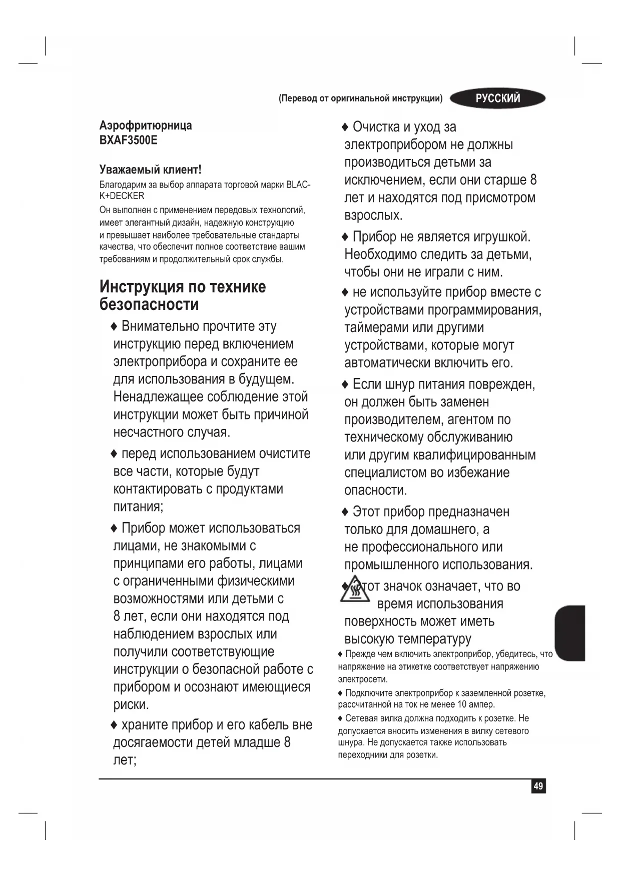 Аэрофритюрница BXAF3500E Уважаемый клиент! Благодарим за выбор аппарата торговой марки BLAC- K+DECKER Он выполнен с применением передовых технологий, имеет элегантный дизайн, надежную конструкцию и превышает наиболее требовательные стандарты качества, что обеспечит полное соответствие вашим требованиям и продолжительный срок службы. Инструкция по технике безопасности ♦ Внимательно прочтите эту инструкцию перед включением электроприбора и сохраните ее для использования в будущем. Ненадлежащее соблюдение этой инструкции может быть причиной несчастного случая. ♦ перед использованием очистите все части, которые будут контактировать с продуктами