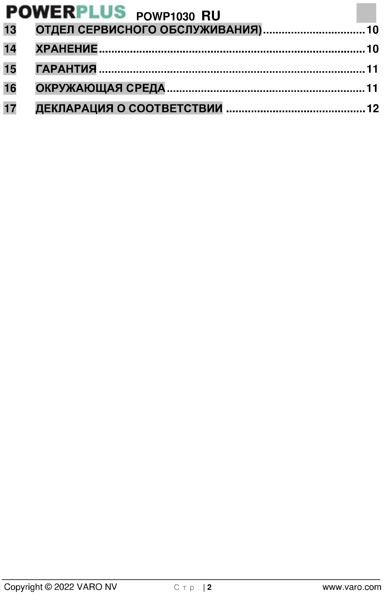 - POWP1030 RU Copyright © 2022 VARO NV С т р . | 2 www.varo.com 13 ОТДЕЛ СЕРВИСНОГО ОБСЛУЖИВАНИЯ) p. 10