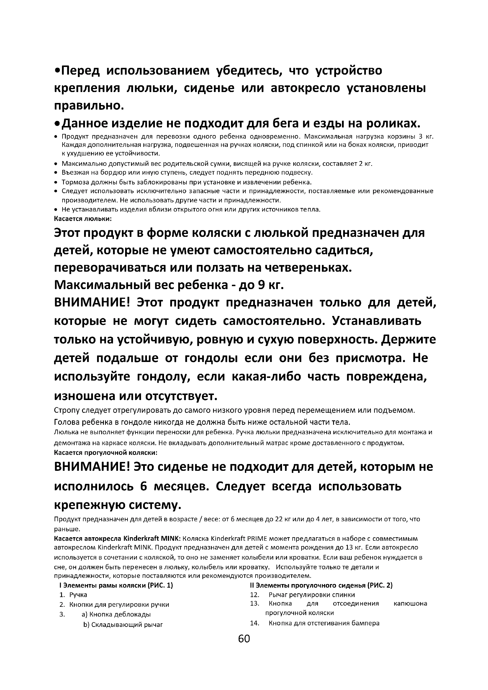 - Не устанавливать изделия вблизи открытого огня или других источников тепла. Касается люльки: Этот продукт в форме коляски с люлькой предназначен для детей, которые не умеют самостоятельно садиться, переворачиваться или ползать на четвереньках. Максимальный вес ребенка - до 9 кг. ВНИМАНИЕ! Этот продукт предназначен только для детей, которые не могут сидеть самостоятельно. Устанавливать только на устойчивую, ровную и сухую поверхность. Держите детей подальше от гондолы если они без присмотра. Не используйте гондолу, если какая-либо часть повреждена, изношена или отсутствует. Стропу следует отрегулировать до самого низкого уровня перед перемещением или подъемом. Голова ребенка в гондоле никогда не должна быть ниже остальной части тела. Люлька не выполняет функции переноски для ребенка. Ручка люльки предназначена исключительно для монтажа и демонтажа на каркасе коляски. Не вкладывать дополнительный матрас кроме доставленного с продуктом. Касается прогулочной коляски: ВНИМАНИЕ! Это сиденье не подходит для детей, которым не исполнилось 6 месяцев. Следует всегда использовать крепежную систему. Продукт предназначен для детей в возрасте / весе: от 6 месяцев до 22 кг или до 4 лет, в зависимости от того, что