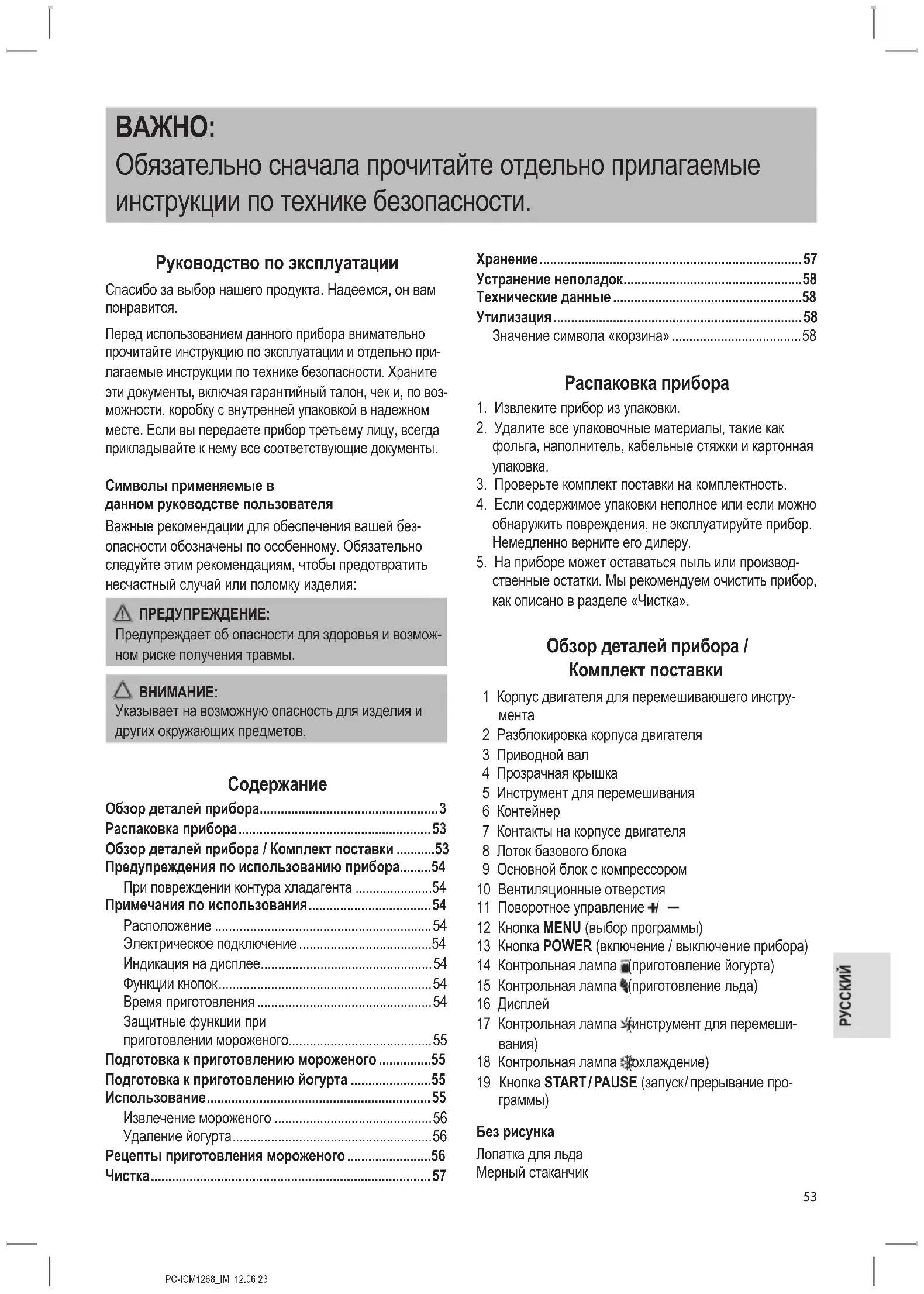 - Консистенция йогурта становится более плотной, если после приготовления поместить его в холо- дильник.PC-ICM1268_IM 12.06.23