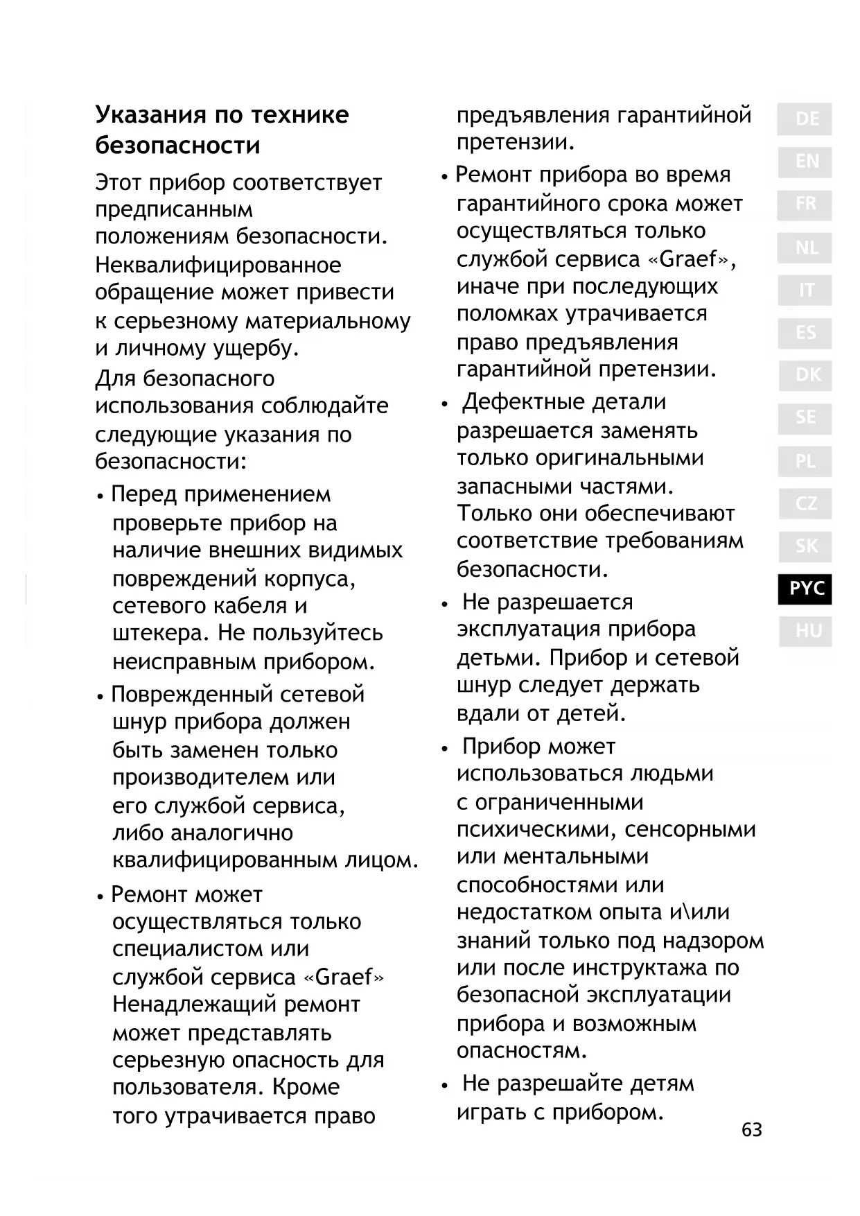 - Ремонт прибора во время гарантийного срока может осуществляться только службой сервиса «Graef», иначе при последующих поломках утрачивается право предъявления гарантийной претензии.