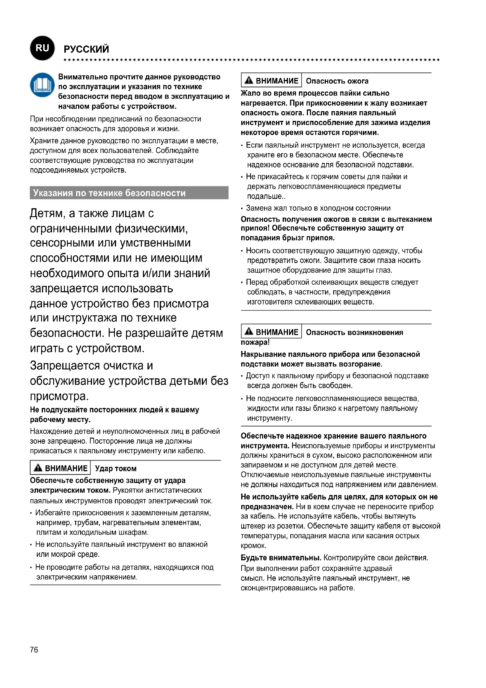 RU Pусский Указания по технике безопасности | Паять | Использование по назначению | Группы пользователей | Уход и техническое обслуживание | Гарантия | Технические характеристики | Температурная характеристика | Символы