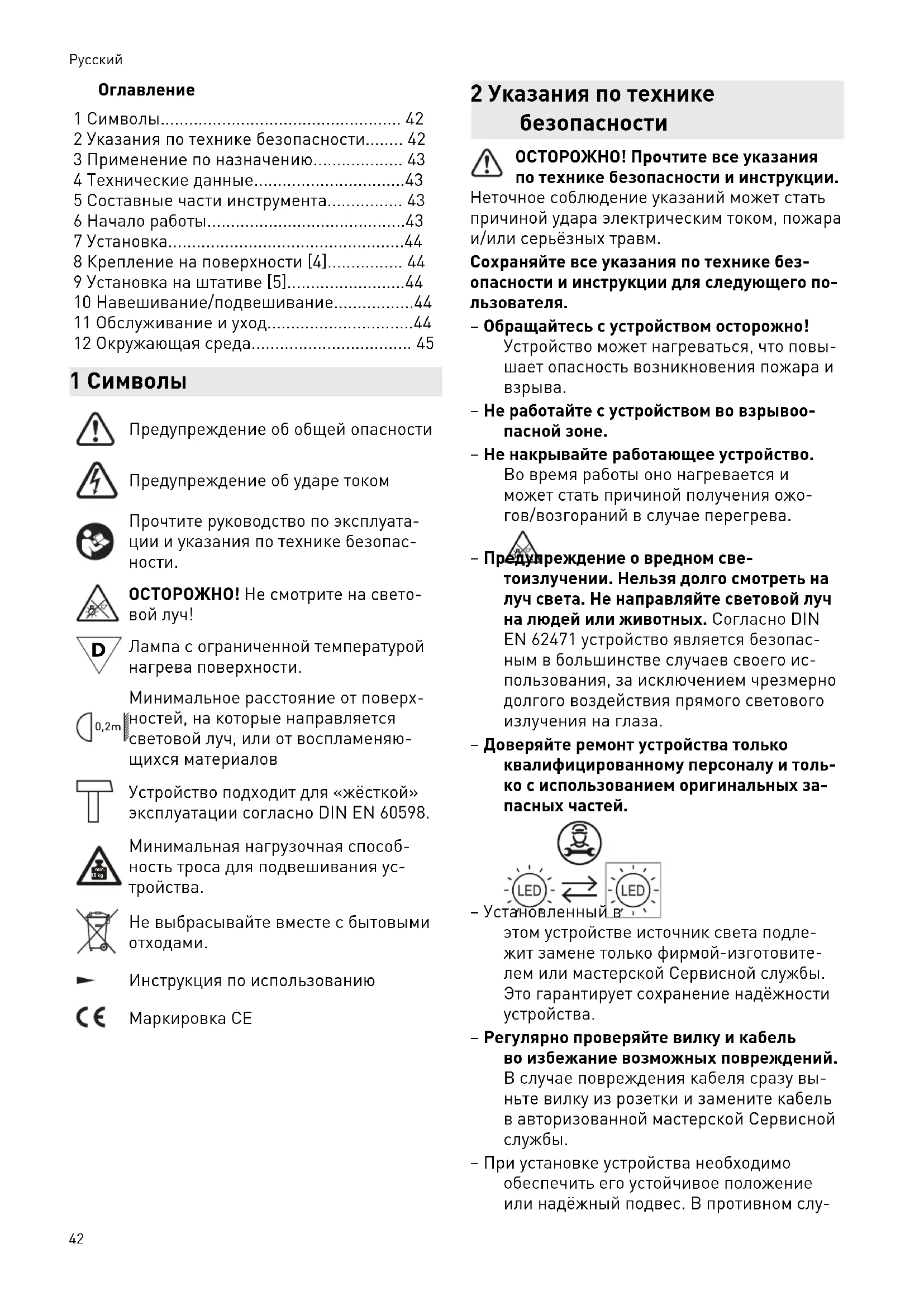 – Не работайте с устройством во взрывоо пасной зоне. – Не накрывайте работающее устройство. Во время работы оно нагревается и может стать причиной получения ожо гов/возгораний в случае перегрева. – Предупреждение о вредном све тоизлучении. Нельзя долго смотреть на луч света. Не направляйте световой луч на людей или животных. Согласно DIN EN 62471 устройство является безопас ным в большинстве случаев своего ис пользования, за исключением чрезмерно долгого воздействия прямого светового излучения на глаза. – Доверяйте ремонт устройства только квалифицированному персоналу и толь ко с использованием оригинальных за пасных частей. – Установленный в этом устройстве источник света подле жит замене только фирмой-изготовите лем или мастерской Сервисной службы. Это гарантирует сохранение надёжности устройства. – Регулярно проверяйте вилку и кабель во избежание возможных повреждений. В случае повреждения кабеля сразу вы ньте вилку из розетки и замените кабель в авторизованной мастерской Сервисной