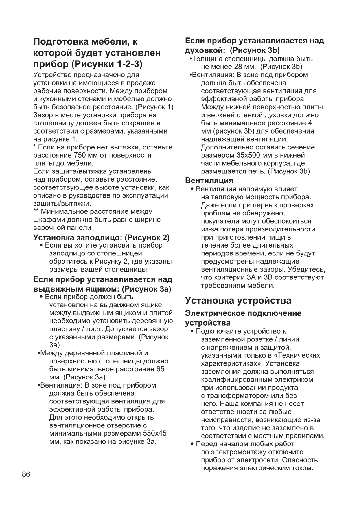 - Вентиляция напрямую влияет на тепловую мощность прибора. Даже если при первых проверках проблем не обнаружено, покупатели могут обеспокоиться из-за потери производительности при приготовлении пищи в течение более длительных периодов времени, если не будут предусмотрены надлежащие вентиляционные зазоры. Убедитесь, что критерии 3A и 3B соответствуют требованиям мебели. Установка устройства Электрическое подключение