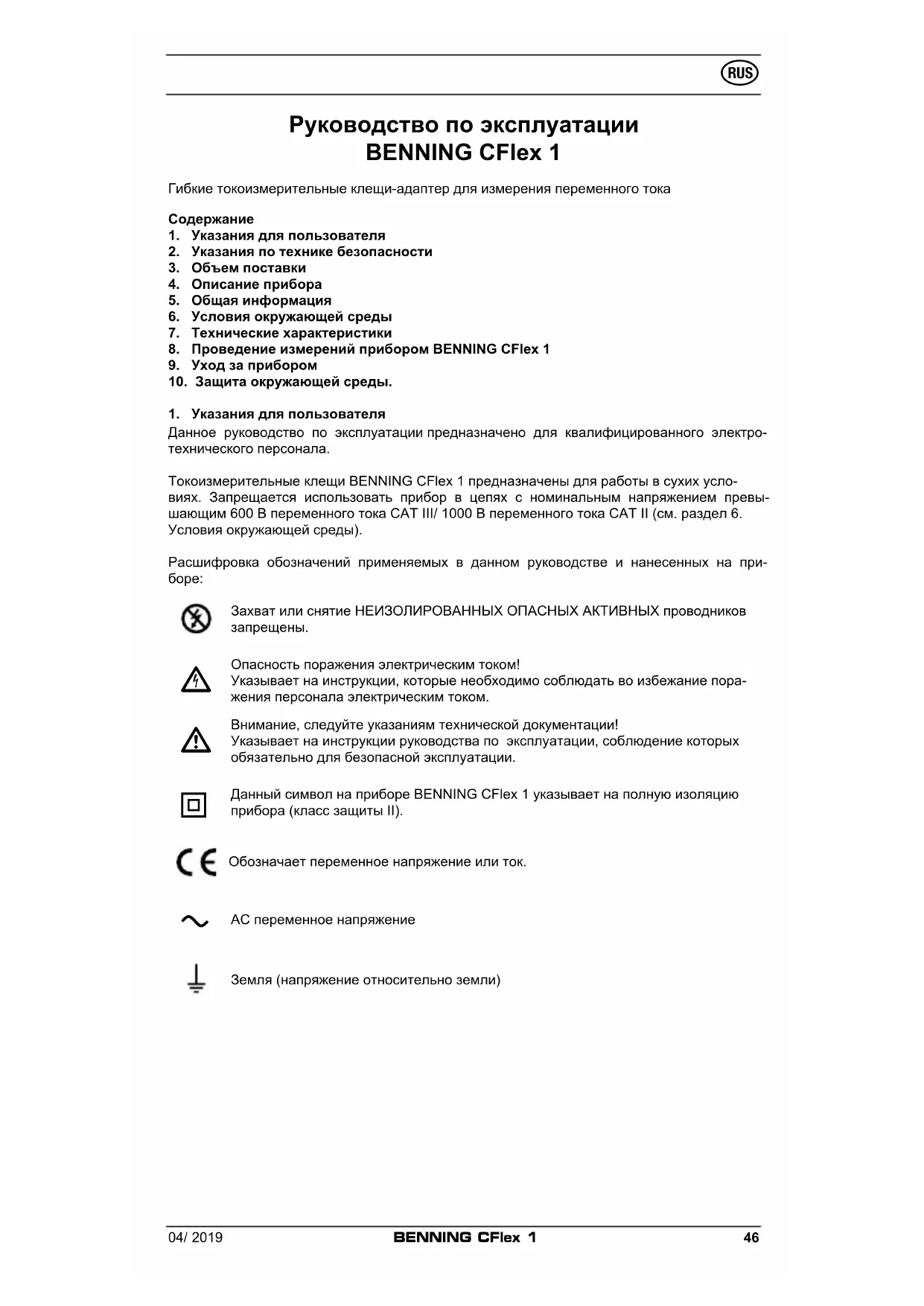 Руководство по эксплуатации BENNING CFlex 1 Гибкие токоизмерительные клещи-адаптер для измерения переменного токаСодержание1. Указания для пользователя2. Указания по технике безопасности3. Объем поставки4. Описание прибора5. Общая информация6. Условия окружающей среды7. Технические характеристики8. Проведение измерений прибором BENNING CFlex 19. Уход за прибором10. Защита окружающей среды.1. Указания для пользователяДанное руководство по эксплуатации предназначено для квалифицированного электро-технического персонала.Токоизмерительные клещи BENNING CFlex 1 предназначены для работы в сухих усло-виях. Запрещается использовать прибор в цепях с номинальным напряжением превы-шающим 600 В переменного тока CAT III/ 1000 В переменного тока CAT II (см. раздел 6. Условия окружающей среды).Расшифровка обозначений применяемых в данном руководстве и нанесенных на при-боре:Захват или снятие НЕИЗОЛИРОВАННЫХ ОПАСНЫХ АКТИВНЫХ проводников запрещены. Опасность поражения электрическим током!Указывает на инструкции, которые необходимо соблюдать во избежание пора-жения персонала электрическим током. Внимание, следуйте указаниям технической документации!Указывает на инструкции руководства по эксплуатации, соблюдение которых обязательно для безопасной эксплуатации. Данный символ на приборе BENNING CFlex 1 указывает на полную изоляцию прибора (класс защиты II).Обозначает переменное напряжение или ток. AC переменное напряжениеЗемля (напряжение относительно земли)04/ 2019 BENNING CFlex 1