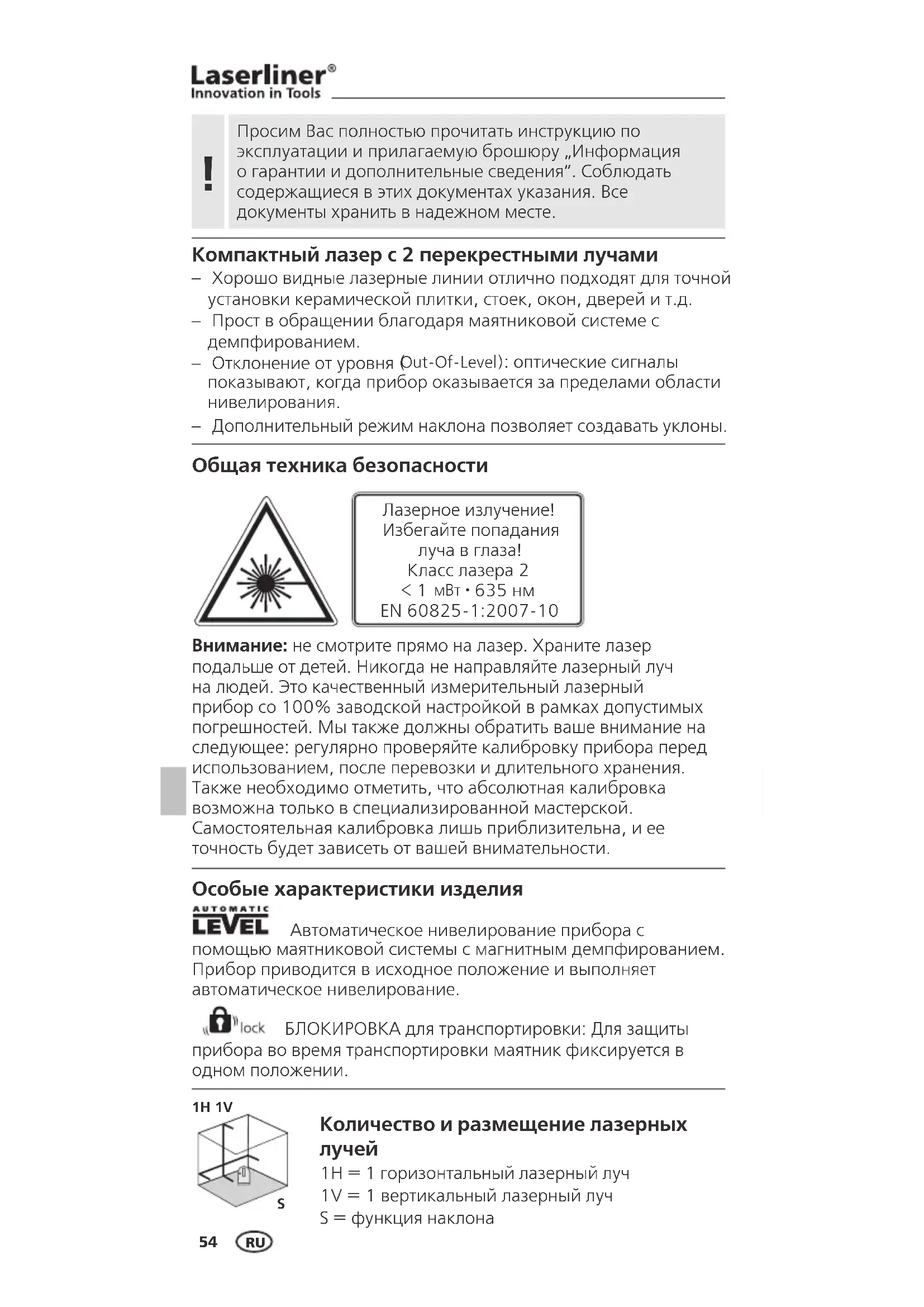 ve A2 noktalarÚ arasÚnda yatay bir referans çizginiz vardÚr. Düĵey çizginin kontrolü: CihazÚ bir duvara yaklaŭÚk 5 m mesafede kurunuz. Duvara 2,5 m uzunluŒunda bir ipi bulunan çekül baŒlayÚnÚz. Çekül boŭta sarkabilme- lidir. CihazÚ çalÚŭtÚrÚp düŭey lazer çizgisini çekül ipine doŒrultunuz. Lazer çizgisi ile çekül ipi arasÚ ndaki sapma ± 1.5 mm‘den fazla olmadÚŒÚ tak- dirde, hassasiyet tolerans dahilinde olur. Yatay çizginin kontrolü: CihazÚ bir duvara yaklaŭÚk 5 m mesafede kurup lazer artÚsÚnÚ çalÚŭtÚrÚnÚz. Duvarda B noktasÚnÚ iŭaretleyiniz. Lazer artÚsÚnÚ yakl. 2,5 saŒa kaydÚrÚp, C noktasÚnÚ iŭaretleyiniz. C noktasÚndaki yatay çizginin B noktasÚyla ± 2 mm’lik bir aralÚkta aynÚ hizada bulunup bulunmadÚŒÚn kontrol ediniz. AynÚ iŭlemi bu sefer sola kaydÚrarak tekrar ediniz. TR54 Компактный лазер с 2 перекрестными лучами – Хорошо видные лазерные линии отлично подходят для точной установки керамической плитки, стоек, окон, дверей и т.д. – Прост в обращении благодаря маятниковой системе с демпфированием. – Отклонение от уровня ( Out-Of-Level): оптические сигналы показывают, когда прибор оказывается за пределами области нивелирования. – Дополнительный режим наклона позволяет создавать уклоны. Особые характеристики изделия Автоматическое нивелирование прибора с помощью маятниковой системы с магнитным демпфированием. Прибор приводится в исходное положение и выполняет автоматическое нивелирование. БЛОКИРОВКА для транспортировки: Для защиты прибора во время транспортировки маятник фиксируется в одном положении. Внимание: не смотрите прямо на лазер. Храните лазер подальше от детей. Никогда не направляйте лазерный луч на людей. Это качественный измерительный лазерный прибор со 100% заводской настройкой в рамках допустимых погрешностей. Мы также должны обратить ваше внимание на следующее: регулярно проверяйте калибровку прибора перед использованием, после перевозки и длительного хранения. Также необходимо отметить, что абсолютная калибровка возможна только в специализированной мастерской. Самостоятельная калибровка лишь приблизительна, и ее точность будет зависеть от вашей внимательности. Общая техника безопасности Лазерное излучение! Избегайте попадания луча в глаза! Класс лазера 2 < 1