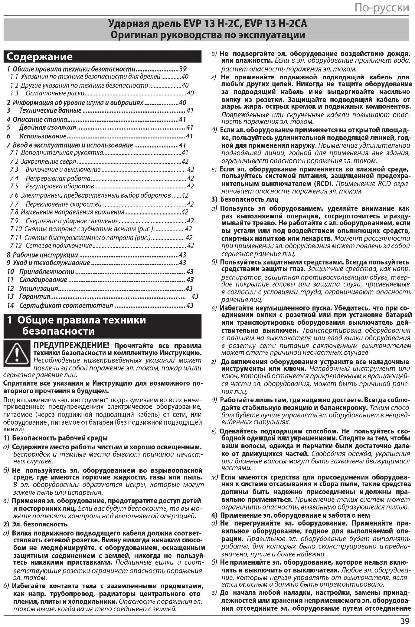- 14 Сертификат соответютвия 1 Общие правила техники безопасности ПРЕДУПРЕЖДЕНИЕ! Прочитайте все правила техники безопасности и комплектную Инструкцию. Несоблюдение нижеприведенных указаний может повлечь за собой поражение эл. током, пожар и/или серьезное ранение лиц. Спрятайте все указания и Инструкцию для возможного по- вторного прочтения в будущем. Под выражением «эл. инструмент“ подразумеваем во всех ниже‑ приведенных предупреждениях электрическое оборудование, питаемое (через подвижной подводящий кабель) от сети, или оборудование , питаемое от батареи (без подвижной подводящей p. 43