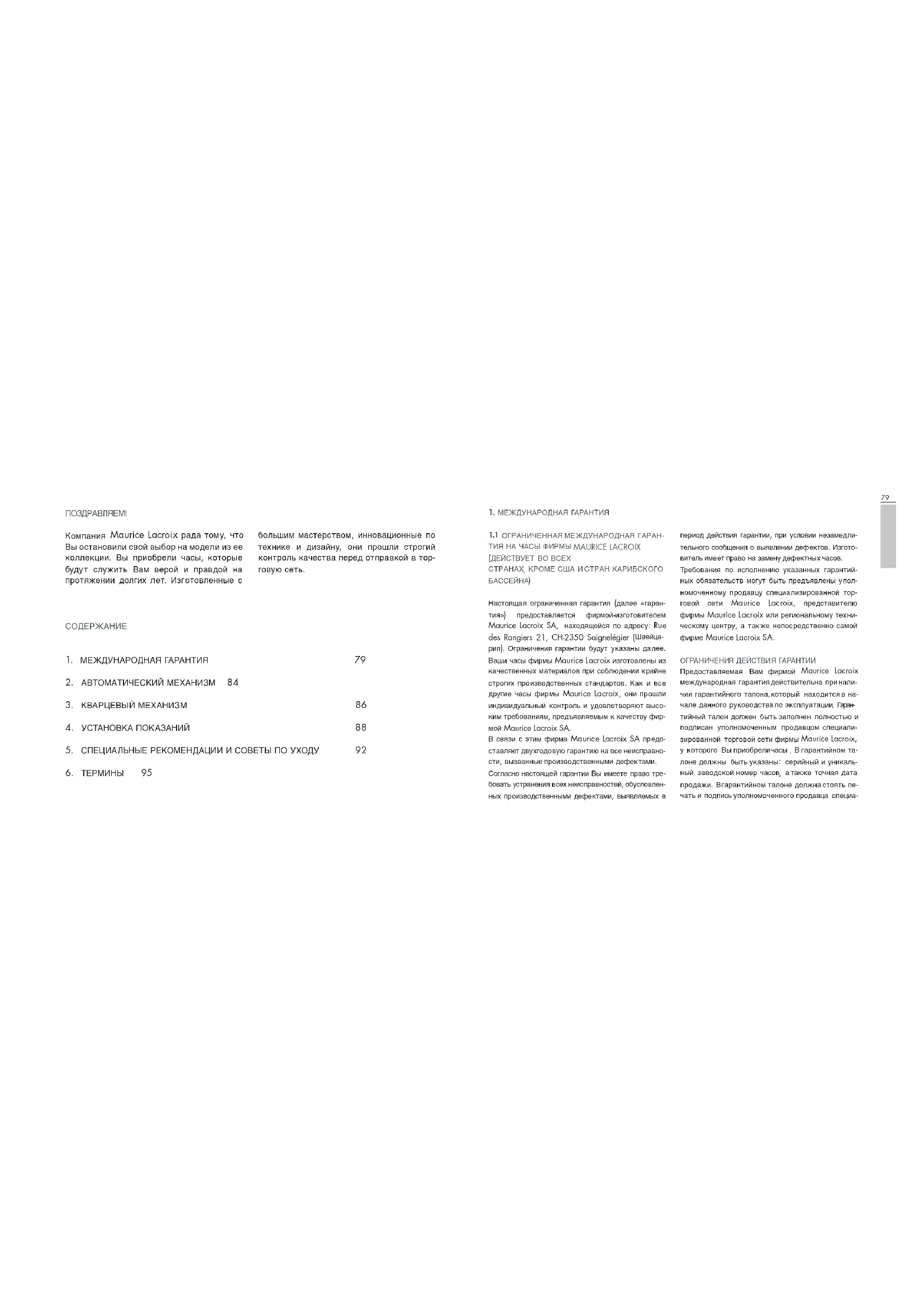рия). Ограничения гарантии будут указаны далее. Ваши часы фирмы Maurice Lacroix изготовлены из качественных материа лов при соблюдении крайне строгих производственных стандартов. Как и все другие часы фирмы Maurice Lacroix, они прошли индивидуальный контроль и удовлетворяют высо- ким требованиям, предъявляемым к качеству фир- мой Maurice Lacroix SA. В связи с этим фирма Maurice Lacroix SA предо- ставляет двухгодовую гарантию на все неисправно- сти, вызванные производственными дефектами. Согласно настоящей гарантии Вы имеете право тре- бовать устранения всех неисправностей, обусловлен- ных производственными деф ектами, выявляемых в период действия гарантии, при условии незамедли- тельного сообщения о выявлении дефектов. Изгото- витель имеет право на замену дефектных часов. Требования по исполнению указанных гарантий- ных обязательств могут быть предъявлены упол- номоченному продавцу специализированной тор- говой сети Maurice Lacroix, представителю фирмы Maurice Lacroix или региональному техни- че скому центру, а также непосредственно самой фирме Maurice Lacroix SA. ОГРАНИЧЕНИЯ ДЕЙСТВИЯ ГАРАНТИИ Предоставляемая