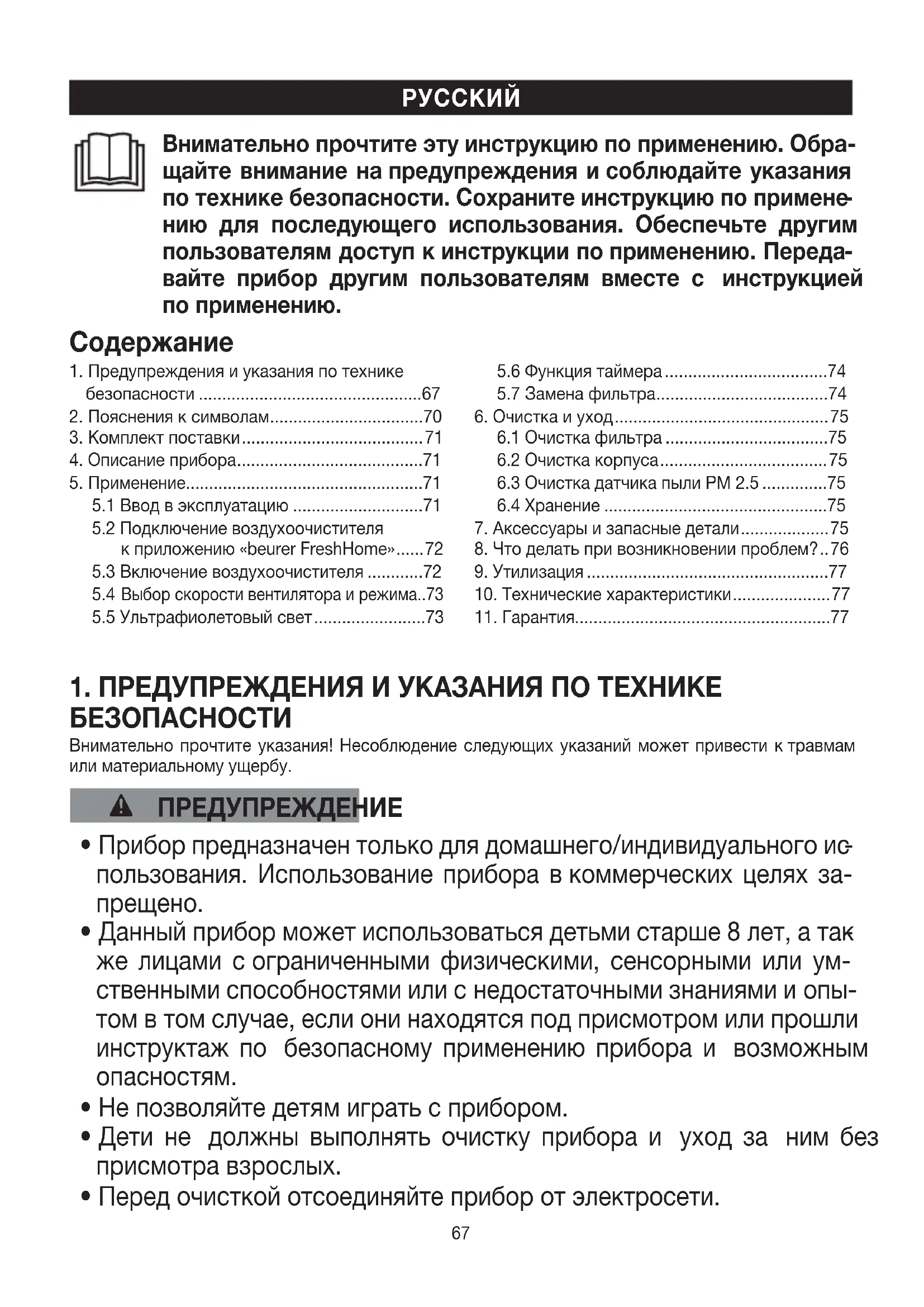 мо утилизировать. Если он несъемный, тонеобходимо утилизиро- вать весь прибор. Использование по назначению Данный прибор предназначен исключительно для очистки воздуха впомещениях. Используйте прибор только втех целях, для которых он был разработан, итолько тем способом, который описан вданной инструкции поприменению. Любое применение непоназначению может быть опасным. Какое-либо иное применение, не рекомендуемое производителем, может привести квозгоранию, удару током или травмированию людей. Производитель ненесет ответственности заущерб вследствие ненадлежащего использования прибора или халатного обращения сним. ПРЕДУПРЕЖДЕНИЕ