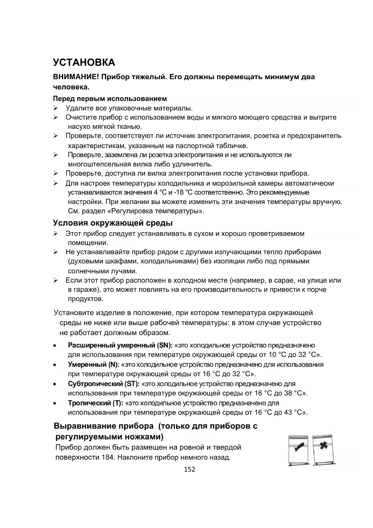 - Тропический (T): «это холодильное устройство предназначено для использования при температуре окружающей среды от 16 °С до 43 °С». Выравнивание прибора (только для приборов с регулируемыми ножками) Прибор должен быть размещен на ровной и твердой поверхности 184. Наклоните прибор немного назад.153