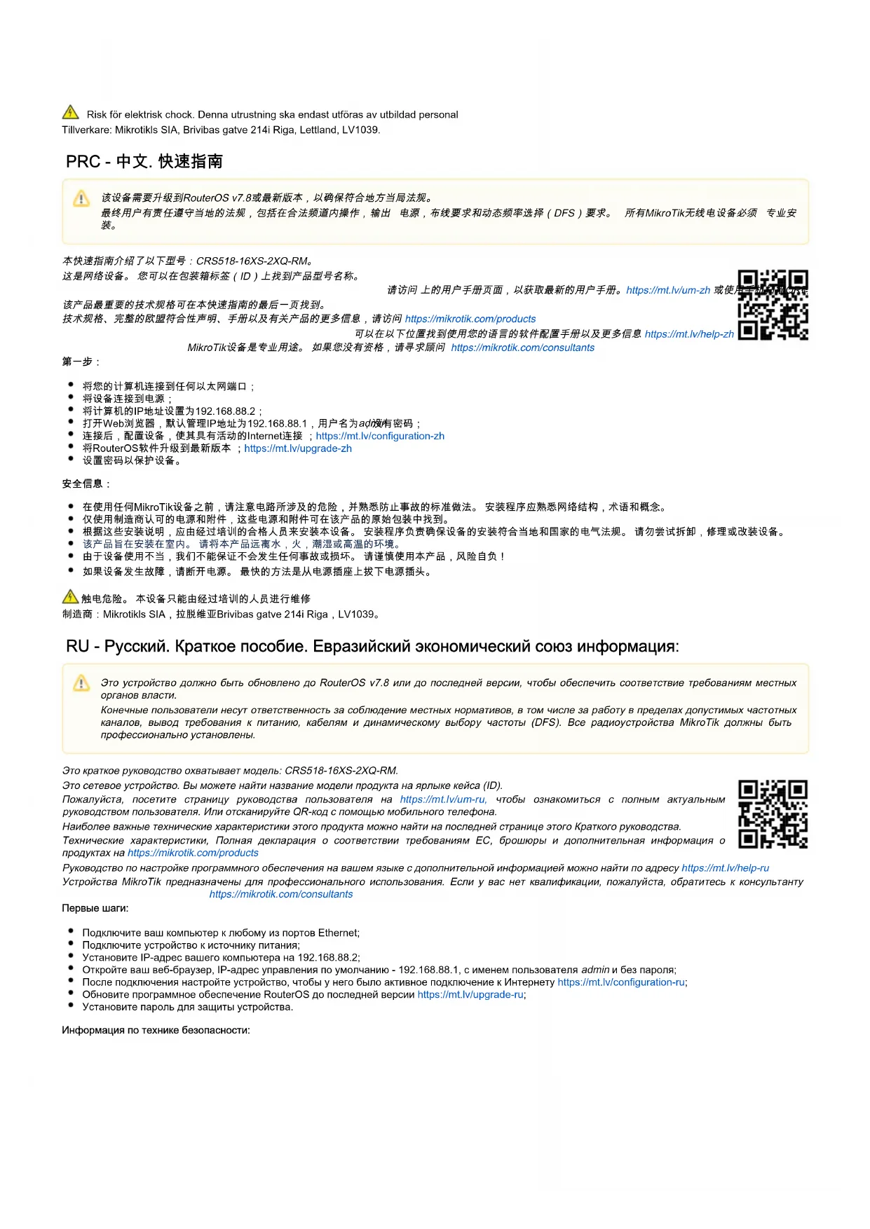 Это сетевое устройство. Вы можете найти название модели продукта на ярлыке кейса (ID). Пожалуйста, посетите страницу руководства пользователя на чтобы ознакомиться с полным актуальнымhttps://mt.lv/um-ru, руководством пользователя. Или отсканируйте QR-код с помощью мобильного телефона. Наиболее важные технические характеристики этого продукта можно найти на последней странице этого Краткого руководства. Технические характеристики, Полная декларация о соответствии требованиям ЕС, брошюры и дополнительная информация о продуктах на https://mikrotik.com/products Руководство по настройке программного обеспечения на вашем языке с дополнительной информацией можно найти по адресу https://mt.lv/help-ru Устройства MikroTik предназначены для профессионального использования. Если у вас нет квалификации, пожалуйста, обратитесь к консультанту https://mikrotik.com/consultants Первые шаги: Подключите ваш компьютер к любому из портов Ethernet; Подключите устройство к источнику питания; Установите IP-адрес вашего компьютера на 192.168.88.2; Откройте ваш веб-браузер, IP-адрес управления по умолчанию - 192.168.88.1, с именем пользователя и без пароля; admin