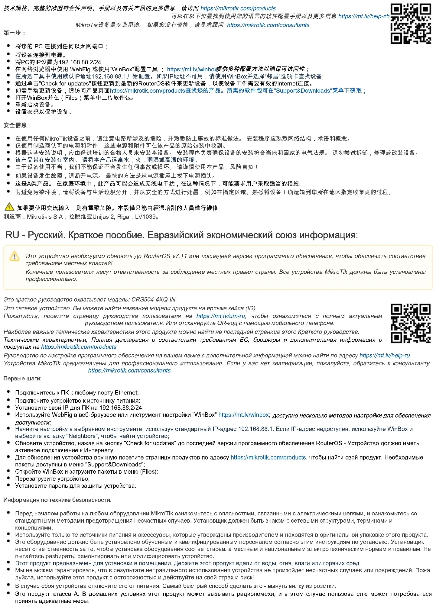 Это сетевое устройство. Вы можете найти название модели продукта на ярлыке кейса (ID). Пожалуйста, посетите страницу руководства пользователя на чтобы ознакомиться с полным актуальнымhttps://mt.lv/um-ru, руководством пользователя. Или отсканируйте QR-код с помощью мобильного телефона. Наиболее важные технические характеристики этого продукта можно найти на последней странице этого Краткого руководства. Технические характеристики, Полная декларация о соответствии требованиям ЕС, брошюры и дополнительная информация о продуктах наhttps://mikrotik.com/products Руководство по настройке программного обеспечения на вашем языке с дополнительной информацией можно найти по адресу https://mt.lv/help-ru Устройства MikroTik предназначены для профессионального использования. Если у вас нет квалификации, пожалуйста, обратитесь к консультанту https://mikrotik.com/consultants Первые шаги: Подключитесь к ПК к любому порту Ethernet; Подключите устройство к источнику питания; Установите свой IP для ПК на 192.168.88.2/24 Используйте WebFig в веб-браузере или инструмент настройки ”WinBox” ;https://mt.lv/winbox доступно несколько методов настройки для обеспечения доступности; Начните настройку в выбранном инструменте, используя стандартный IP-адрес 192.168.88.1. Если IP-адрес недоступен, используйте WinBox и выберите вкладку "Neighbors", чтобы найти устройство; Обновите устройство, нажав на кнопку "Check for updates" до последней версии программного обеспечения RouterOS -Устройство должно иметь активное подключение к Интернету; Для обновления устройства вручную посетите страницу продуктов по адресу , чтобы найти свой продукт. Необходимые https://mikrotik.com/products пакеты доступны в меню "Support&Downloads"; Откройте WinBox и загрузите пакеты в меню (Files); Перезагрузите устройство; Установите пароль для защиты устройства. Информация по технике безопасности: Перед началом работы на любом оборудовании MikroTik ознакомьтесь с опасностями, связанными с электрическими цепями, и ознакомьтесь со стандартными методами предотвращения несчастных случаев.Установщик должен быть знаком с сетевыми структурами, терминами и концепциями. Используйте только те источники питания и аксессуары, которые утверждены производителем и находятся в оригинальной упаковке этого продукта. Это оборудование должно быть установлено обученным и квалифицированным персоналом согласно этим инструкциям по установке.Установщик несет ответственность за то, чтобы установка оборудования соответствовала местным и национальным электротехническим нормам и правилам. Не пытайтесь разбирать, ремонтировать или модифицировать устройство. Этот продукт предназначен для установки в помещении.Держите этот продукт вдали от воды, огня, влаги или горячих сред. Мы не можем гарантировать, что в результате неправильного использования устройства не произойдет несчастных случаев или повреждений.Пожа луйста, используйте этот продукт с осторожностью и действуйте на свой страх и риск! В случае сбоя устройства отключите его от питания.Самый быстрый способ сделать это - вынуть вилку из розетки. Это продукт класса А. В домашних условиях этот продукт может вызывать радиопомехи, и в этом случае пользователю может потребоваться принять адекватные меры. Это устройство необходимо обновить до RouterOS v7.11 или последней версии программного обеспечения, чтобы обеспечить соответствие требованиям местных властей! Конечн