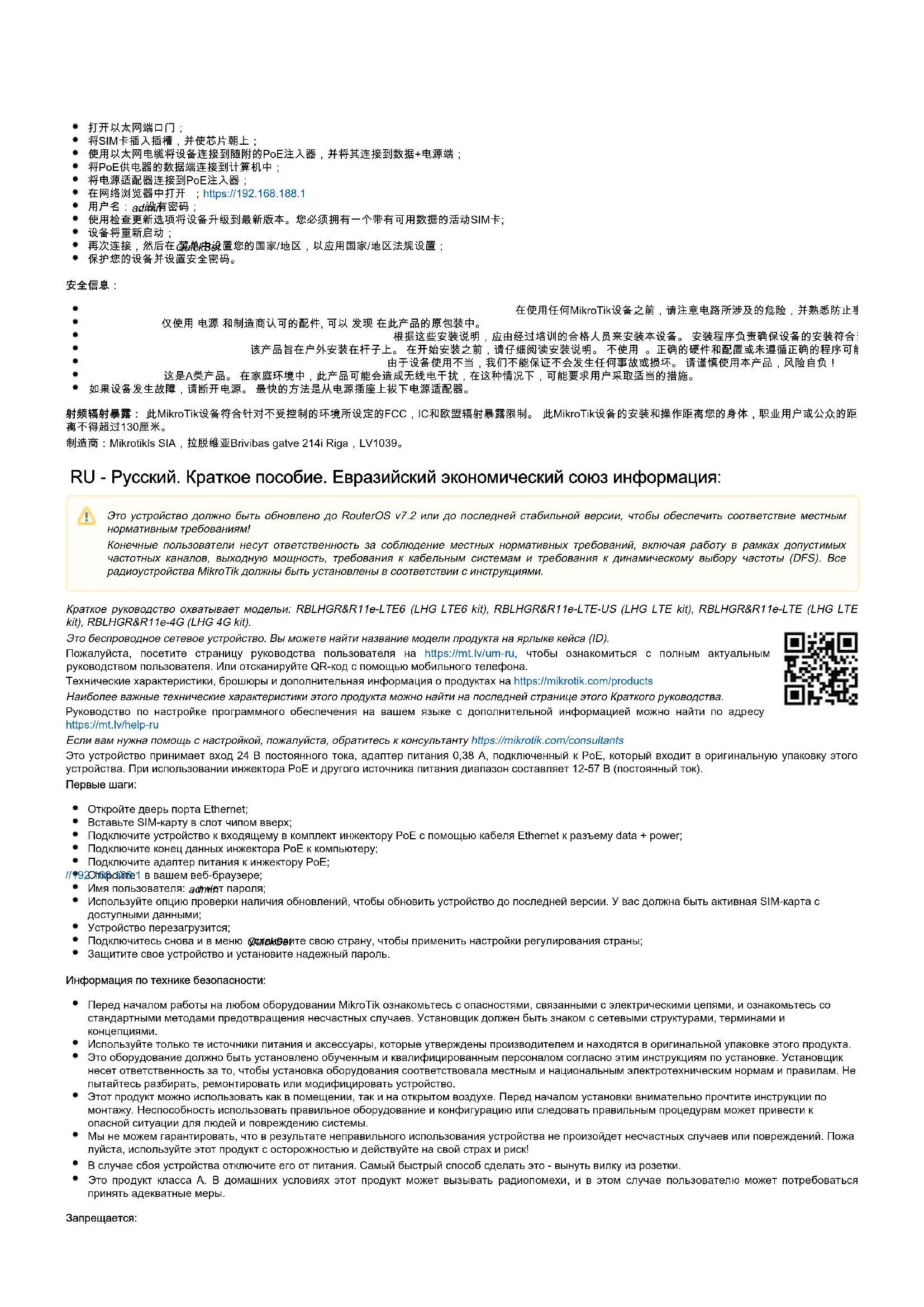 Это беспроводное сетевое устройство. Вы можете найти название модели продукта на ярлыке кейса (ID). Пожалуйста, посетите страницу руководства пользователя на чтобы ознакомиться с полным актуальнымhttps://mt.lv/um-ru, руководством пользователя. Или отсканируйте QR-код с помощью мобильного телефона. Технические характеристики, брошюры и дополнительная информация о продуктах на https://mikrotik.com/products Наиболее важные технические характеристики этого продукта можно найти на последней странице этого Краткого руководства. Руководство по настройке программного обеспечения на вашем языке с дополнительной информацией можно найти по адресу https://mt.lv/help-ru Если вам нужна помощь с настройкой, пожалуйста, обратитесь к консультанту https://mikrotik.com/consultants Это устройство принимает вход 24 В постоянного тока, адаптер питания 0,38 А, подключенный к PoE, который входит в оригинальную упаковку этого устройства. При использовании инжектора PoE и другого источника питания диапазон составляет 12-57 В (постоянный ток). Первые шаги: Откройте дверь порта Ethernet; Вставьте SIM-карту в слот чипом вверх; Подключите устройство к входящему в комплект инжектору PoE с помощью кабеля Ethernet к разъему data + power; Подключите конец данных инжектора PoE к компьютеру; Подключите адаптер питания к инжектору PoE; Откройте в вашем веб-браузере;https://192.168.188.1 Имя пользователя: , и нет пароля; admin Используйте опцию проверки наличия обновлений, чтобы обновить устройство до последней версии. У вас должна быть активная SIM-карта с доступными данными; Устройство перезагрузится; Подключитесь снова и в меню установите свою страну, чтобы применить настройки регулирования страны; QuickSet Защитите свое устройство и установите надежный пароль. Информация по технике безопасности: Перед началом работы на любом оборудовании MikroTik ознакомьтесь с опасностями, связанными с электрическими цепями, и ознакомьтесь со стандартными методами предотвращения несчастных случаев.Установщик должен быть знаком с сетевыми структурами, терминами и концепциями. Используйте только те источники питания и аксессуары, которые утверждены производителем и находятся в оригинальной упаковке этого продукта. Это оборудование должно быть установлено обученным и квалифицированным персоналом согласно этим инструкциям по установке.Установщик несет ответственность за то, чтобы установка оборудования соответствовала местным и национальным электротехническим нормам и правилам. Не пытайтесь разбирать, ремонтировать или модифицировать устройство. Этот продукт можно использовать как в помещении, так и на открытом воздухе. Перед началом установки внимательно прочтите инструкции по монтажу. Неспособность использовать правильное оборудование и конфигурацию или следовать правильным процедурам может привести к опасной ситуации для людей и повреждению системы. Мы не можем гарантировать, что в результате неправильного использования устройства не произойдет несчастных случаев или повреждений.Пожа луйста, используйте этот продукт с осторожностью и действуйте на свой страх и риск! В случае сбоя устройства отключите его от питания.Самый быстрый способ сделать это - вынуть вилку из розетки. Это продукт класса А. омашних условиях этот продукт может вызывать радиопомехи, и в этом случае пользователю может потребоватьсяВ д принять адекватные меры. Зап