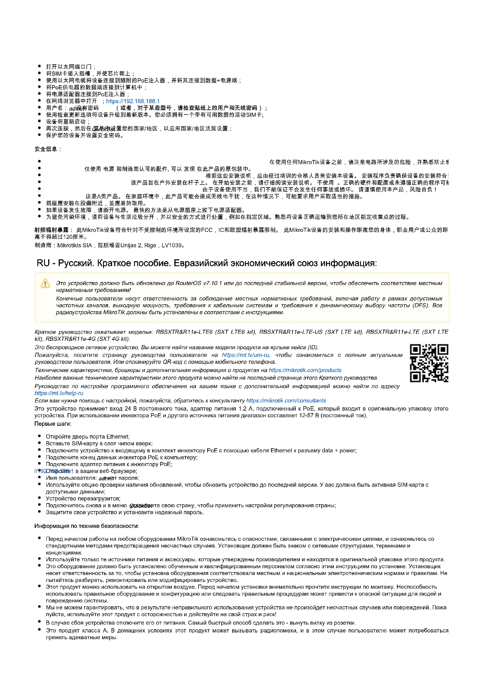 Это беспроводное сетевое устройство. Вы можете найти название модели продукта на ярлыке кейса (ID). Пожалуйста, посетите страницу руководства пользователя на чтобы ознакомиться с полным актуальнымhttps://mt.lv/um-ru, руководством пользователя. Или отсканируйте QR-код с помощью мобильного телефона. Технические характеристики, брошюры и дополнительная информация о продуктах на https://mikrotik.com/products Наиболее важные технические характеристики этого продукта можно найти на последней странице этого Краткого руководства. Руководство по настройке программного обеспечения на вашем языке с дополнительной информацией можно найти по адресу https://mt.lv/help-ru Если вам нужна помощь с настройкой, пожалуйста, обратитесь к консультанту https://mikrotik.com/consultants Это устройство принимает вход 24 В постоянного тока, адаптер питания 1.2 А, подключенный к PoE, который входит в оригинальную упаковку этого устройства. При использовании инжектора PoE и другого источника питания диапазон составляет 12-57 В (постоянный ток). Первые шаги: Откройте дверь порта Ethernet; Вставьте SIM-карту в слот чипом вверх; Подключите устройство к входящему в комплект инжектору PoE с помощью кабеля Ethernet к разъему data + power; Подключите конец данных инжектора PoE к компьютеру; Подключите адаптер питания к инжектору PoE; Откройте в вашем веб-браузере;https://192.168.188.1 Имя пользователя: , и нет пароля; admin Используйте опцию проверки наличия обновлений, чтобы обновить устройство до последней версии. У вас должна быть активная SIM-карта с доступными данными; Устройство перезагрузится; Подключитесь снова и в меню установите свою страну, чтобы применить настройки регулирования страны; QuickSet Защитите свое устройство и установите надежный пароль. Информация по технике безопасности: Перед началом работы на любом оборудовании MikroTik ознакомьтесь с опасностями, связанными с электрическими цепями, и ознакомьтесь со стандартными методами предотвращения несчастных случаев.Установщик должен быть знаком с сетевыми структурами, терминами и концепциями. Используйте только те источники питания и аксессуары, которые утверждены производителем и находятся в оригинальной упаковке этого продукта. Это оборудование должно быть установлено обученным и квалифицированным персоналом согласно этим инструкциям по установке.Установщик несет ответственность за то, чтобы установка оборудования соответствовала местным и национальным электротехническим нормам и правилам. Не пытайтесь разбирать, ремонтировать или модифицировать устройство. Этот продукт можно использовать на открытом воздухе. Перед началом установки внимательно прочтите инструкции по монтажу. Неспособность использовать правильное оборудование и конфигурацию или следовать правильным процедурам может привести к опасной ситуации для людей и повреждению системы. Мы не можем гарантировать, что в результате неправильного использования устройства не произойдет несчастных случаев или повреждений.Пожа луйста, используйте этот продукт с осторожностью и действуйте на свой страх и риск! В случае сбоя устройства отключите его от питания.Самый быстрый способ сделать это - вынуть вилку из розетки. Это продукт класса А. домашних условиях этот продукт может вызывать радиопомехи, и в этом случае пользователю может потребоватьсяВ принять адекватные меры. Это устройство должно быть
