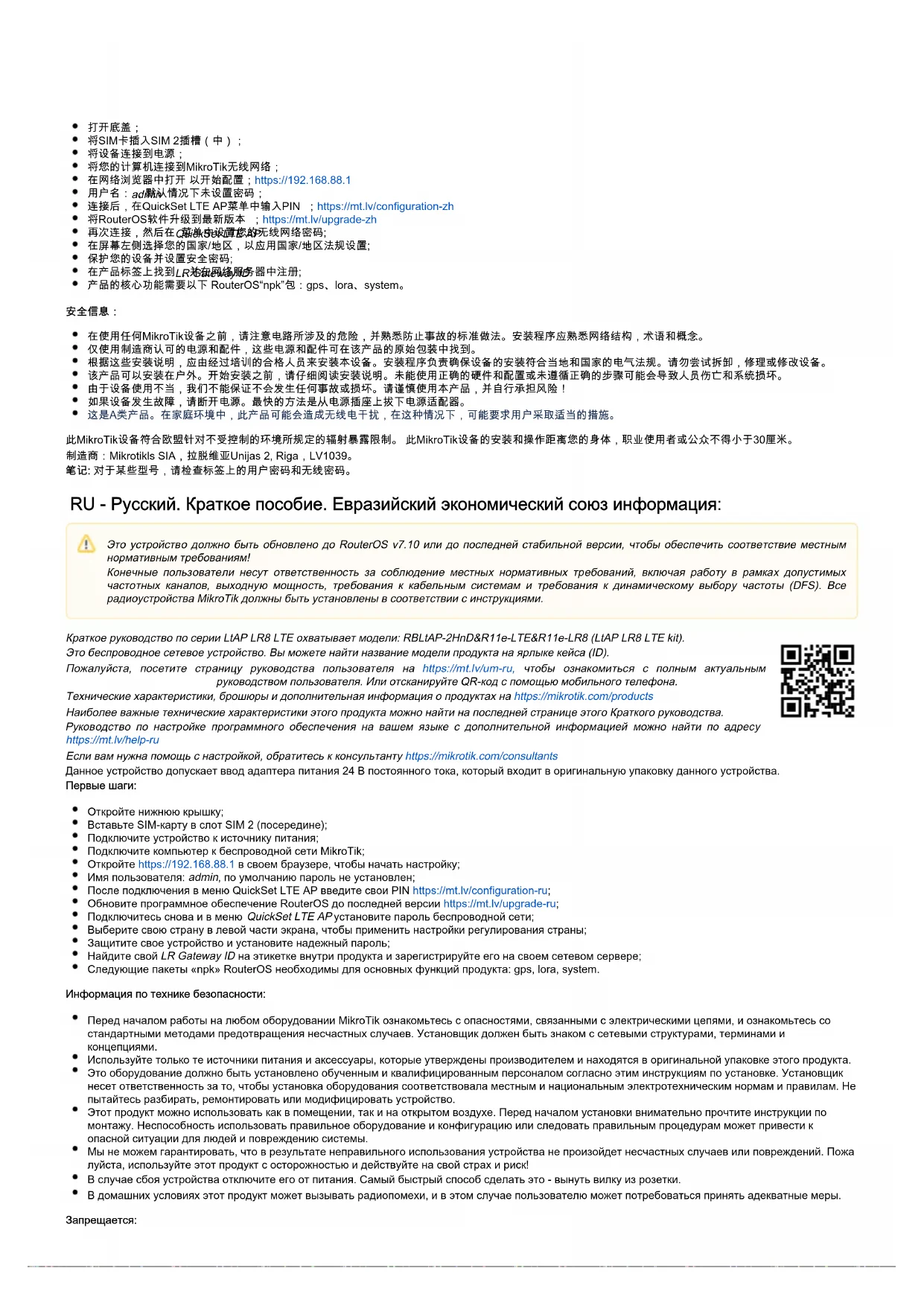 Это беспроводное сетевое устройство. Вы можете найти название модели продукта на ярлыке кейса (ID). Пожалуйста, посетите страницу руководства пользователя на чтобы ознакомиться с полным актуальнымhttps://mt.lv/um-ru, руководством пользователя. Или отсканируйте QR-код с помощью мобильного телефона. Технические характеристики, брошюры и дополнительная информация о продуктах на https://mikrotik.com/products Наиболее важные технические характеристики этого продукта можно найти на последней странице этого Краткого руководства. Руководство по настройке программного обеспечения на вашем языке с дополнительной информацией можно найти по адресу https://mt.lv/help-ru Если вам нужна помощь с настройкой, обратитесь к консультанту https://mikrotik.com/consultants Данное устройство допускает ввод адаптера питания 24 В постоянного тока, который входит в оригинальную упаковку данного устройства. Первые шаги: Откройте нижнюю крышку; Вставьте SIM-карту в слот SIM 2 (посередине); Подключите устройство к источнику питания; Подключите компьютер к беспроводной сети MikroTik; Откройте в своем браузере, чтобы начать настройку;https://192.168.88.1 Имя пользователя: , по умолчанию пароль не установлен; admin После подключения в меню QuickSet LTE AP введите свои PIN ;https://mt.lv/configuration-ru Обновите программное обеспечение RouterOS до последней версии ;https://mt.lv/upgrade-ru Подключитесь снова и в меню установите пароль беспроводной сети; QuickSet LTE AP