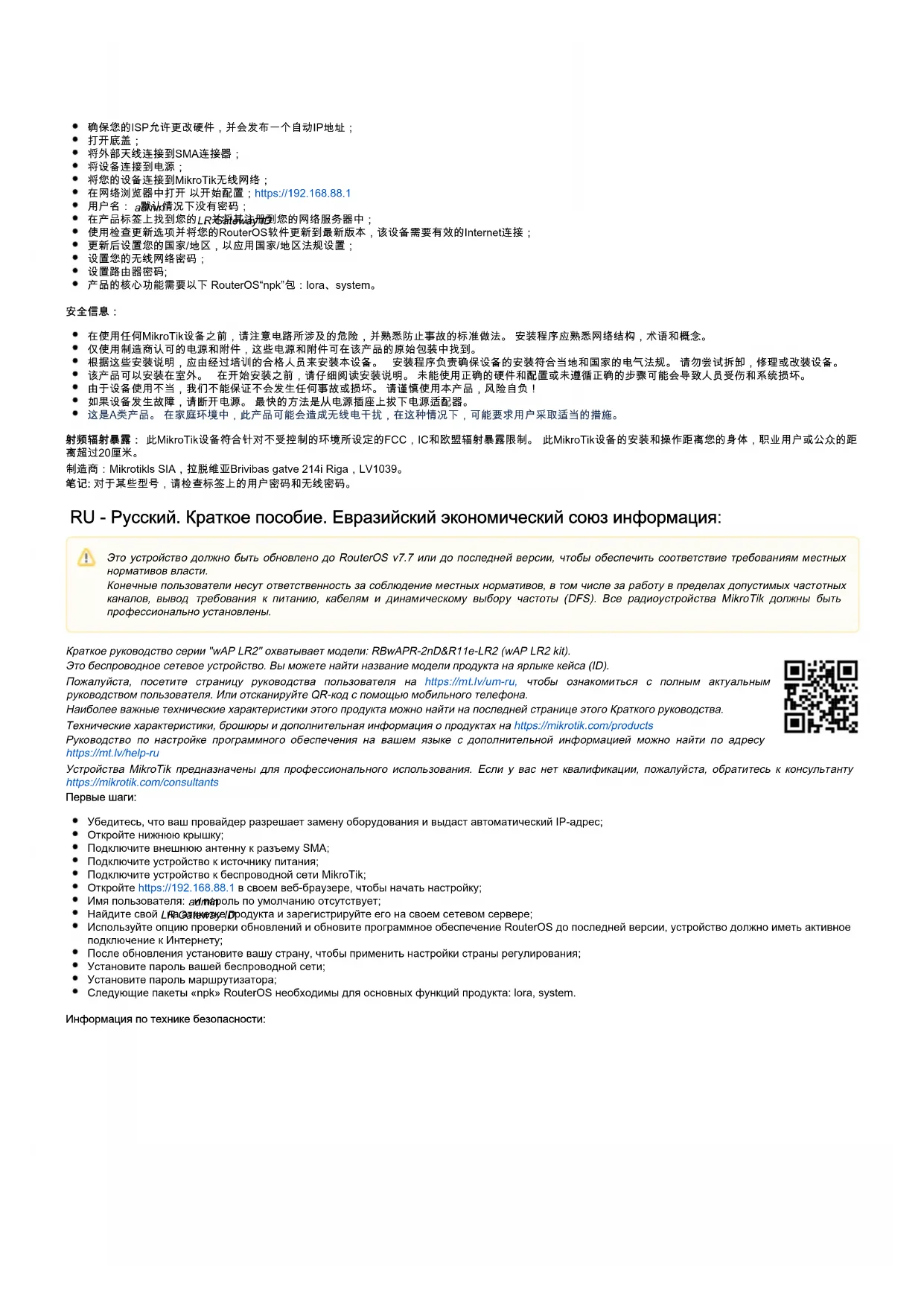 Это беспроводное сетевое устройство. Вы можете найти название модели продукта на ярлыке кейса (ID). Пожалуйста, посетите страницу руководства пользователя на чтобы ознакомиться с полным актуальнымhttps://mt.lv/um-ru, руководством пользователя. Или отсканируйте QR-код с помощью мобильного телефона. Наиболее важные технические характеристики этого продукта можно найти на последней странице этого Краткого руководства. Технические характеристики, брошюры и дополнительная информация о продуктах на https://mikrotik.com/products Руководство по настройке программного обеспечения на вашем языке с дополнительной информацией можно найти по адресу https://mt.lv/help-ru Устройства MikroTik предназначены для профессионального использования. Если у вас нет квалификации, пожалуйста, обратитесь к консультанту https://mikrotik.com/consultants Первые шаги: Убедитесь, что ваш провайдер разрешает замену оборудования и выдаст автоматический IP-адрес; Откройте нижнюю крышку; Подключите внешнюю антенну к разъему SMA; Подключите устройство к источнику питания; Подключите устройство к беспроводной сети MikroTik; Откройте в своем веб-браузере, чтобы начать настройку;https://192.168.88.1 Имя пользователя: и пароль по умолчанию отсутствует; admin Найдите свой на этикетке продукта и зарегистрируйте его на своем сетевом сервере; LR Gateway ID Используйте опцию проверки обновлений и обновите программное обеспечение RouterOS до последней версии, устройство должно иметь активное подключение к Интернету; После обновления установите вашу страну, чтобы применить настройки страны регулирования; Установите пароль вашей беспроводной сети; Установите пароль маршрутизатора; Следующие пакеты «npk» RouterOS необходимы для основных функций продукта: lora, system. Информация по технике безопасности: Это устройство должно быть обновлено до RouterOS v7.7 или до последней версии, чтобы обеспечить соответствие требованиям местных нормативов власти. Конечные пользователи несут ответственность за соблюдение местных нормативов, в том числе за работу в пределах допустимых частотных каналов, вывод