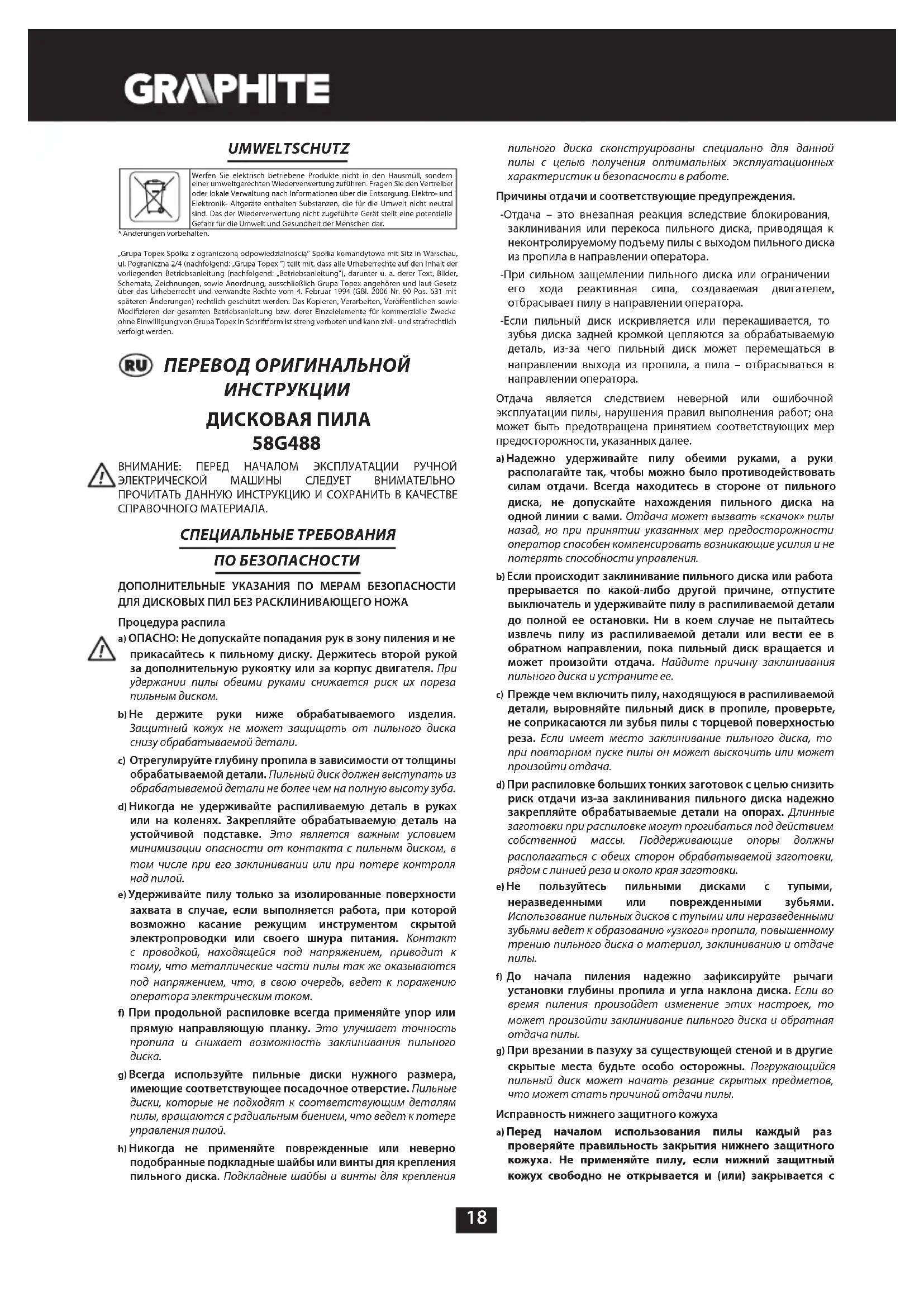 ДИСКОВАЯ ПИЛА 58G488 ВНИМАНИЕ: ПЕРЕД НАЧАЛОМ ЭКСПЛУАТАЦИИ РУЧНОЙ ЭЛЕКТРИЧЕСКОЙ МАШИНЫ СЛЕДУЕТ ВНИМАТЕЛЬНО ПРОЧИТАТЬ ДАННУЮ ИНСТРУКЦИЮ И СОХРАНИТЬ В КАЧЕСТВЕ СПРАВОЧНОГО МАТЕРИАЛА. СПЕЦИАЛЬНЫЕ ТРЕБОВАНИЯ ПО БЕЗОПАСНОСТИ ДОПОЛНИТЕЛЬНЫЕ УКАЗАНИЯ ПО МЕРАМ БЕЗОПАСНОСТИ ДЛЯ ДИСКОВЫХ ПИЛ БЕЗ РАСКЛИНИВАЮЩЕГО НОЖА Процедура распила a) ОПАСНО: Не допускайте попадания рук в зону пиления и не прикасайтесь к пильному диску. Держитесь второй рукой за дополнительную рукоятку или за корпус двигателя. При удержании пилы обеими руками снижается риск их пореза пильным диском. b) Не держите руки ниже обрабатываемого изделия. Защитный кожух не может защищать от пильного диска снизу обрабатываемой детали. c) Отрегулируйте глубину пропила в зависимости от толщины обрабатываемой детали. Пильный диск должен выступать из обрабатываемой детали не более чем на полную высоту зуба. d) Никогда не удерживайте распиливаемую деталь в руках или на коленях. Закрепляйте обрабатываемую деталь на устойчивой подставке. Это является важным условием минимизации опасности от контакта с пильным диском, в том числе при его заклинивании или при потере контроля