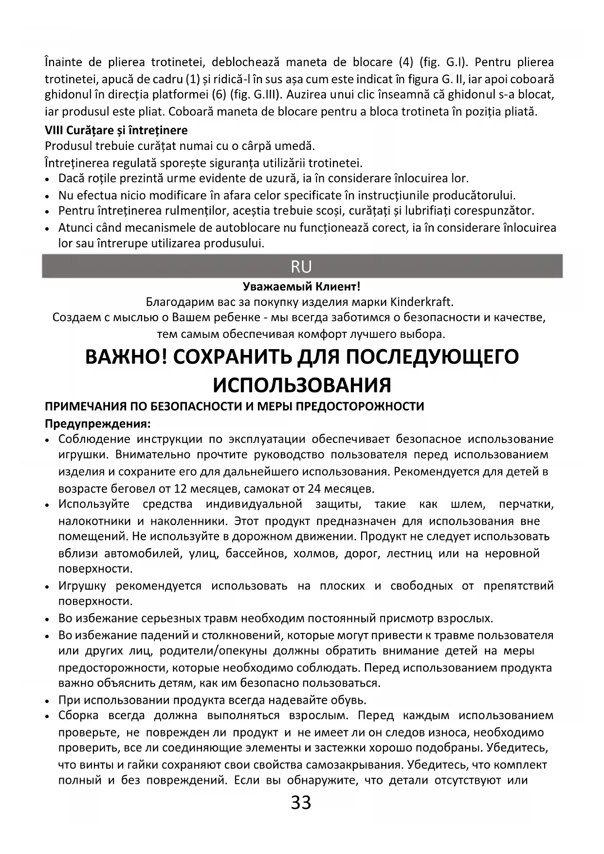 VI Торможение скутера Чтобы воспользоваться тормозом, нажмите на тормоз (5) левой или правой ногой. VII Складывание самоката ВАЖНО! Опасность защемления пальцев! Будьте очень осторожны при складывании. Прежде чем складывать самокат, разблокируйте складную пряжку безопасности (4) (Рис.G.I). Чтобы сложить самокат, возьмитесь за раму (1) и потяните ее вверх, как показано на рис. G.II, и опустите руль в направлении палубы (6) (рис. G.III). После того, как вы отпустите раму, ручка автоматически опустится. «Щелчок» будет означать, что ручка застряла и изделие сложено. Опустите складную пряжку безопасности складывания вниз, чтобы зафиксировать самокат в сложенном положении. VII Очистка и техническое обслуживание Изделие следует протирать только влажной тканью. Регулярное техническое обслуживание повышает безопасность использования самоката.