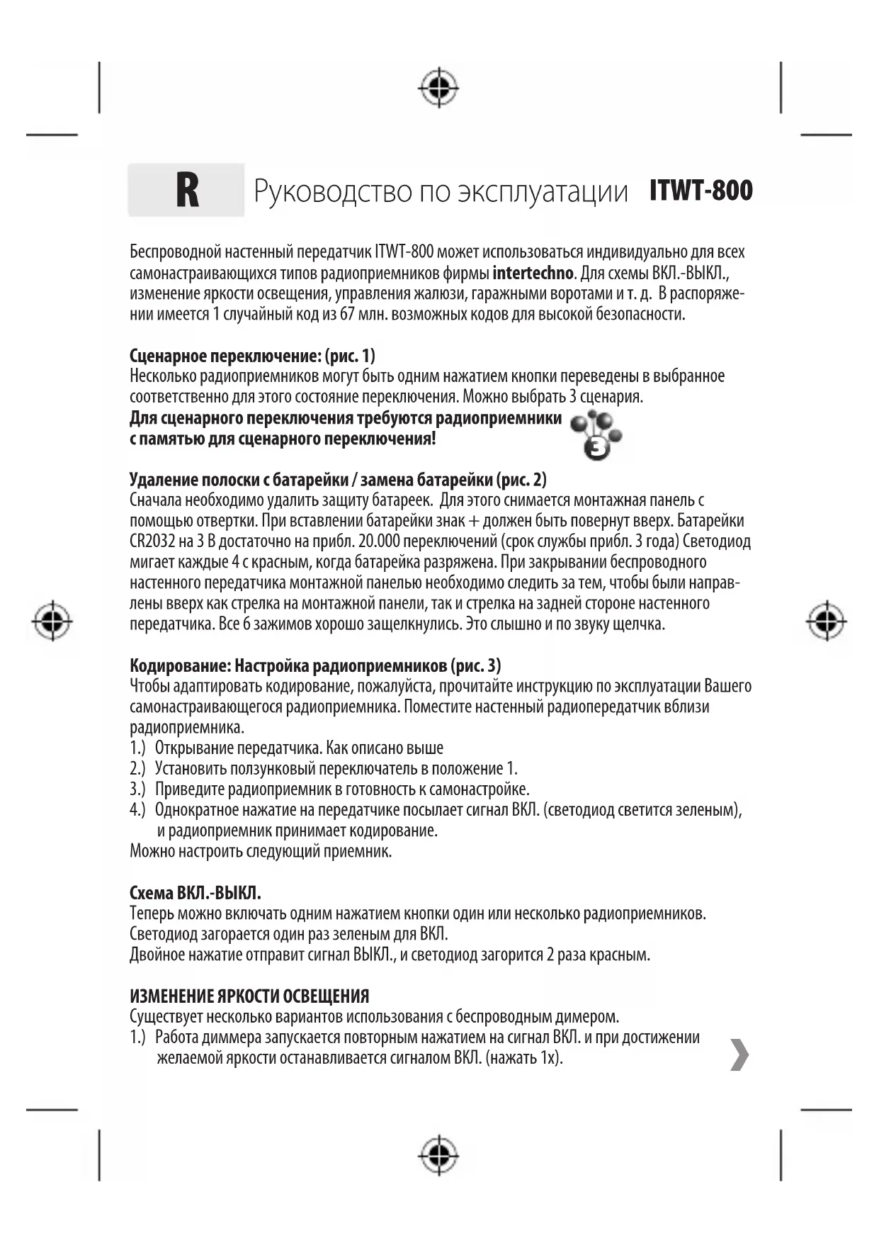 ITWT-800Беспроводной настенный передатчик ITWT-800 может использоваться индивидуально для всех самонастраивающихся типов радиоприемников фирмы intertechno. Для схемы ВКЛ.-ВЫКЛ., изменение яркости освещения, управления жалюзи, гаражными воротами и т. д. В распоряже-нии имеется 1 случайный код из 67 млн. возможных кодов для высокой безопасности. Сценарное переключение: (рис. 1)Несколько радиоприемников могут быть одним нажатием кнопки переведены в выбранное соответственно для этого состояние переключения. Можно выбрать 3 сценария. Для сценарного переключения требуются радиоприемники с памятью для сценарного переключения! Удаление полоски с батарейки / замена батарейки (рис. 2)Сначала необходимо удалить защиту батареек. Для этого снимается монтажная панель с помощью отвертки. При вставлении батарейки знак + должен быть повернут вверх. Батарейки CR2032 на 3 В достаточно на прибл. 20.000 переключений (срок службы прибл. 3 года) Светодиод мигает каждые 4 с красным, когда батарейка разряжена. При закрывании беспроводного настенного передатчика монтажной панелью необходимо следить за тем, чтобы были направ-лены вверх как стрелка на монтажной панели, так и стрелка на задней стороне настенного передатчика. Все 6 зажимов хорошо защелкнулись. Это слышно и по звуку щелчка.Кодирование: Настройка радиоприемников (рис. 3)Чтобы адаптировать кодирование, пожалуйста, прочитайте инструкцию по эксплуатации Вашего самонастраивающегося радиоприемника. Поместите настенный радиопередатчик вблизи радиоприемника.1.) Открывание передатчика. Как описано выше 2.) Установить ползунковый переключатель в положение 1.3.) Приведите радиоприемник в готовность к самонастройке.4.) Однократное нажатие на передатчике посылает сигнал ВКЛ. (светодиод светится зеленым), и радиоприемник принимает кодирование.Можно настроить следующий приемник.Схема ВКЛ.-ВЫКЛ.Теперь можно включать одним нажатием кнопки один или несколько радиоприемников. Светодиод загорается один раз зеленым для ВКЛ. Двойное нажатие отправит сигнал ВЫКЛ., и светодиод загорится 2 раза красным.ИЗМЕНЕНИЕ ЯРКОСТИ ОСВЕЩЕНИЯСуществует несколько вариантов использования c беспроводным димером. 1.) Работа диммера запускается повторным нажатием на сигнал ВКЛ. и при достижении желаемой яркости останавливается сигналом ВКЛ. (нажать 1x).