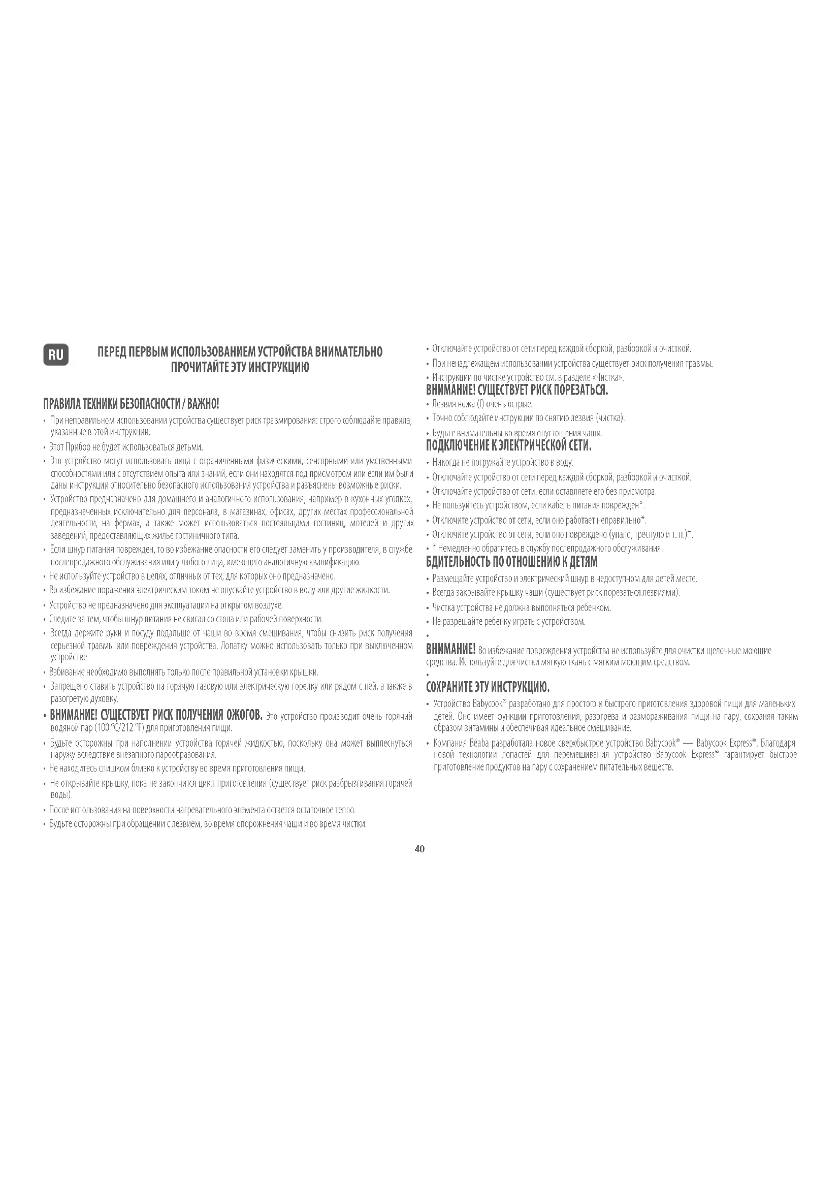 - Компания Béaba разработала новое сверхбыстрое устройство Babycook® — Babycook Express®. Благодаря новой технологии лопастей для перемешивания устройство Babycook Express® гарантирует быстрое приготовление продуктов на пару с сохранением питательных веществ. ПЕРЕД ПЕРВЫМ ИСПОЛЬЗОВАНИЕМ УСТРОЙСТВА ВНИМАТЕЛЬНО ПРОЧИТАЙТЕ ЭТУ ИНСТРУКЦИЮ RUb