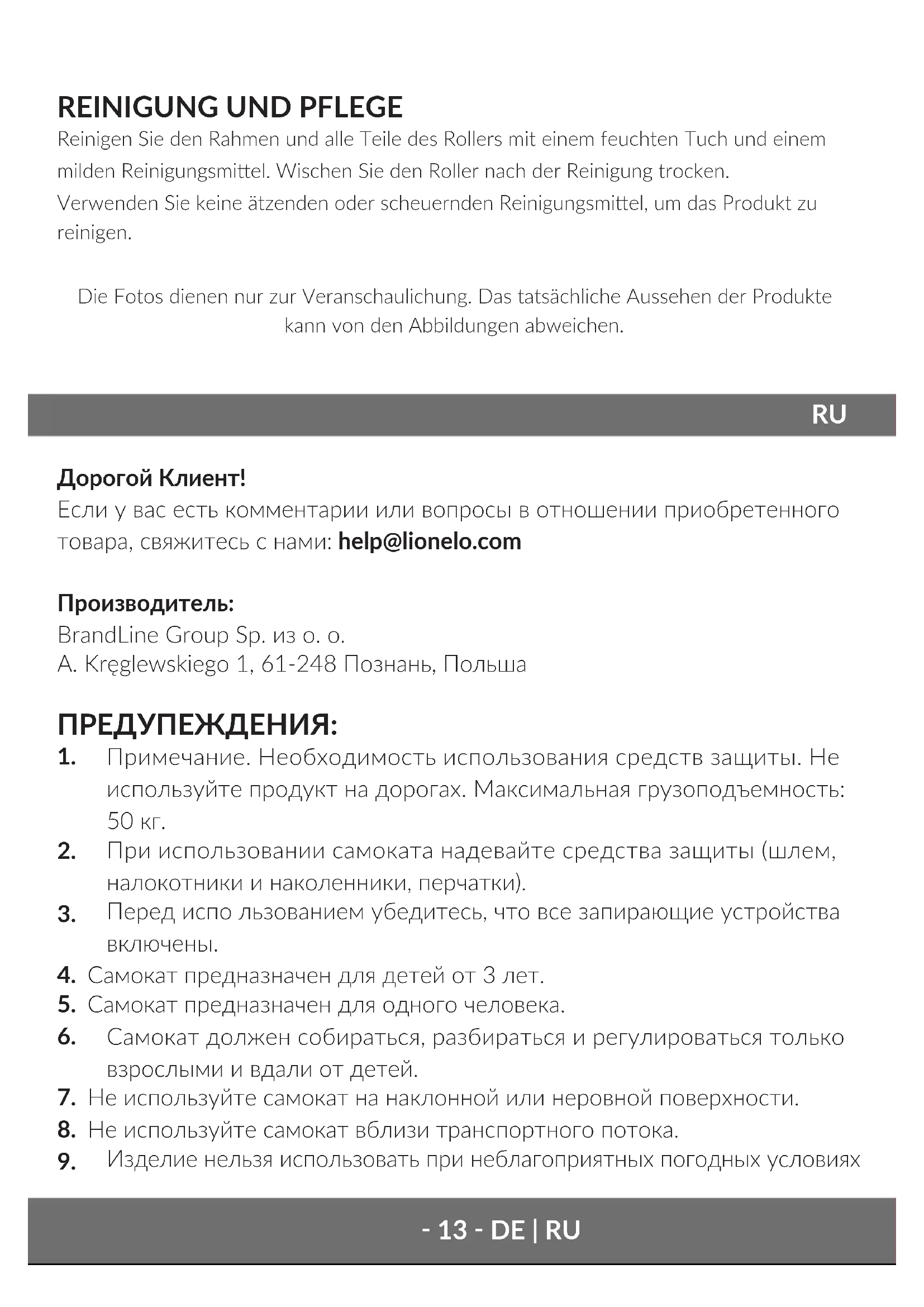 Дорогой Клиент! Если у вас есть комментарии или вопросы в отношении приобретенного товара, свяжитесь с нами: help@lionelo.com Производитель: BrandLine Group Sp. из о. о. A. Kręglewskiego 1, 61-248 Познань, Польша ПРЕДУПЕЖДЕНИЯ: