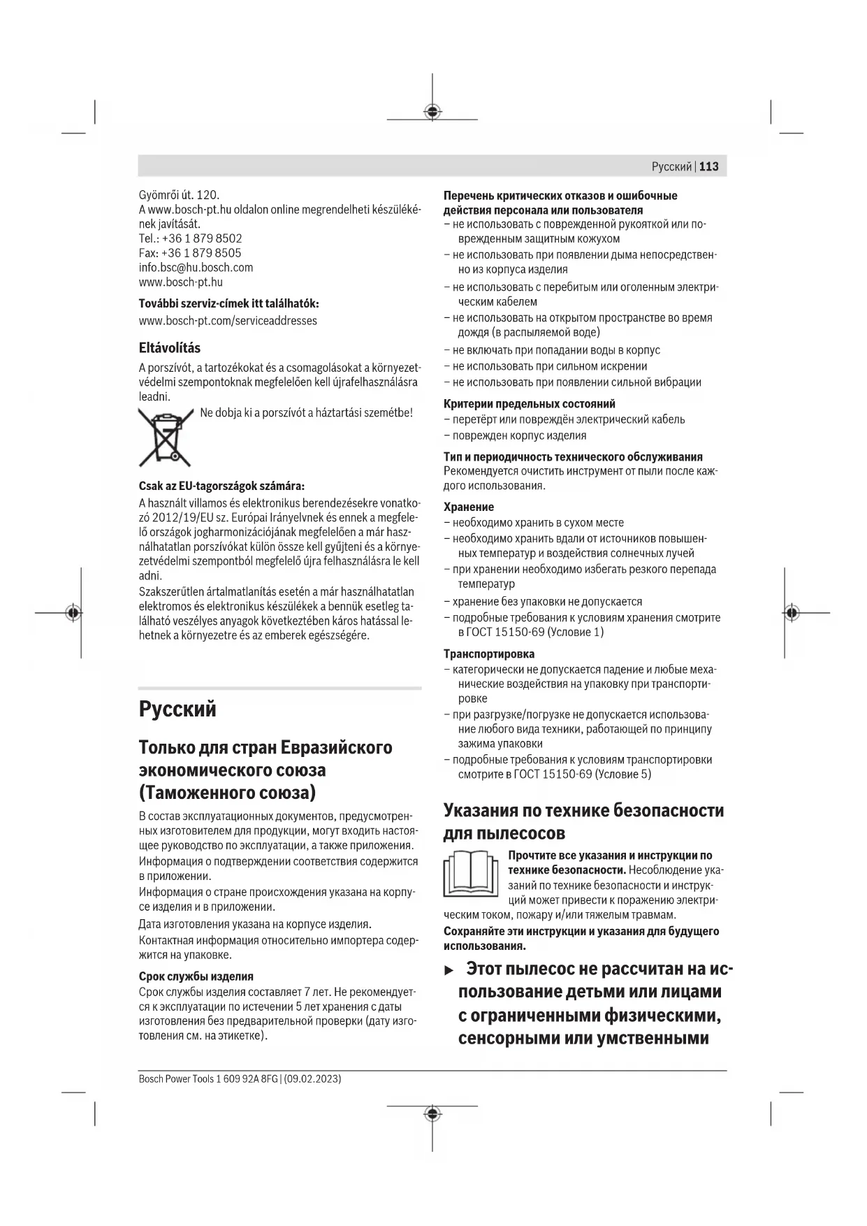 – при разгрузке/погрузке не допускается использова- ние любого вида техники, работающей по принципу зажима упаковки – подробные требования к условиям транспортировки смотрите в ГОСТ 15150-69 (Условие 5) Указания по технике безопасности для пылесосов Прочтите все указания и инструкции по технике безопасности. Несоблюдение ука- заний по технике безопасности и инструк- ций может привести к поражению электри- ческим током, пожару и/или тяжелым травмам. Сохраняйте эти инструкции и указания для будущего использования. u Этот пылесос не рассчитан на ис- пользование детьми или лицами с ограниченными физическими, сенсорными или умственными Bosch Power Tools 1 609 92A 8FG | (09.02.2023)114 | Русский способностями или недостаточ- ным опытом и знаниями. Иначе существует опасность неправиль- ного использования или получе-