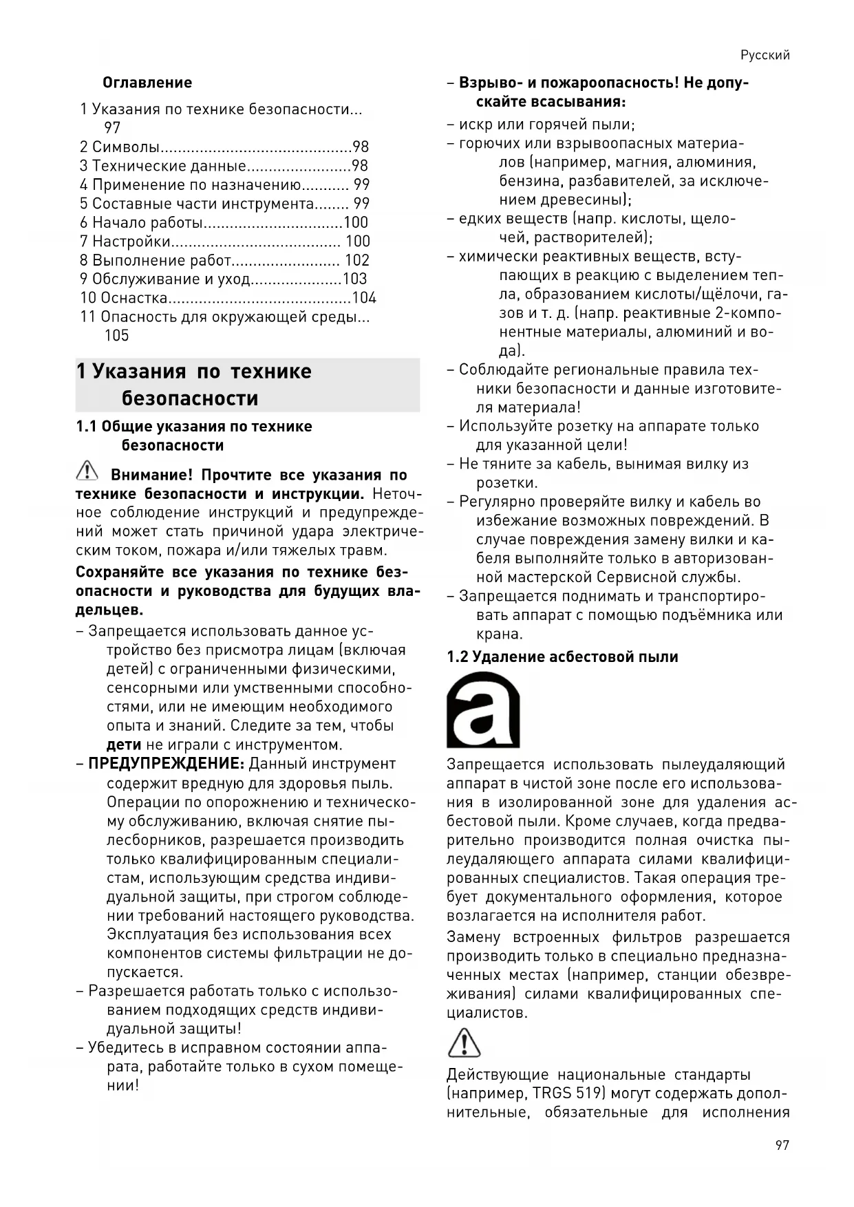 Действующие национальные стандарты (например, TRGS 519) могут содержать допол нительные, обязательные для исполнения Pусский 97требования к работам по удалению асбесто содержащей пыли, а также требования, кото рые могут регламентировать или ограничи вать область применения пылеудаляющего