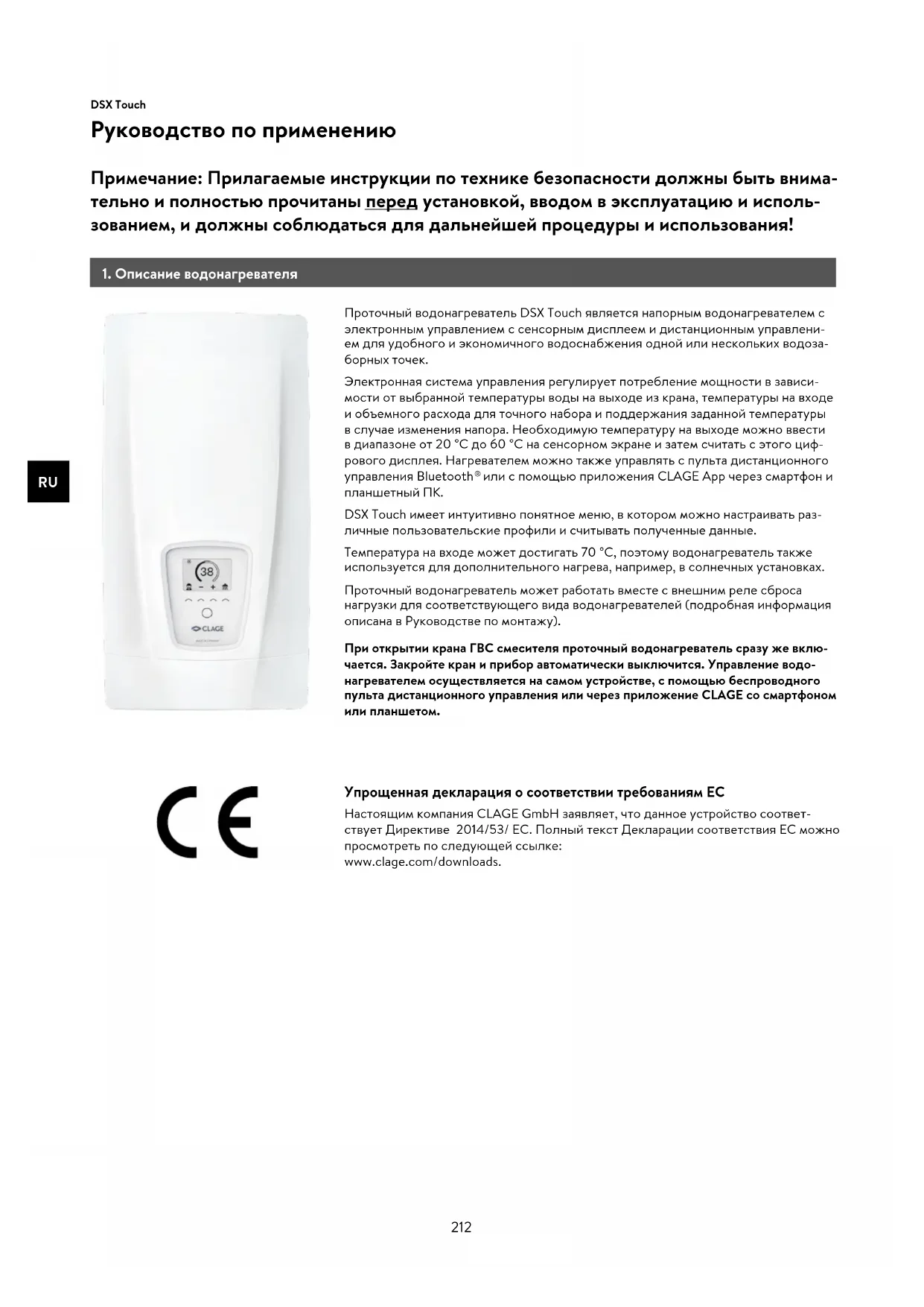 или с помощью приложения CLAGE App через смартфон и планшетный ПК. DSX Touch имеет интуитивно понятное меню, в котором можно настраивать раз- личные пользовательские профили и считывать полученные данные. Температура на входе может достигать 70 °C, поэтому водонагреватель также используется для дополнительного нагрева, например, в солнечных установках. Проточный водонагреватель может работать вместе с внешним реле сброса нагрузки для соответствующего вида водонагревателей (подробная информация описана в Руководстве по монтажу). Руководство по применению Примечание: Прилагаемые инструкции по технике безопасности должны быть внима- тельно и полностью прочитаны перед установкой, вводом в эксплуатацию и исполь- зованием, и должны соблюдаться для дальнейшей процедуры и использования! Упрощенная декларация о соответствии требованиям ЕС Настоящим компания CLAGE GmbH заявляет, что данное устройство соответ- ствует Директиве 2014/53/ EС. Полный текст Декларации соответствия ЕС можно просмотреть по следующей ссылке: www.clage.com/downloads.CLAGE